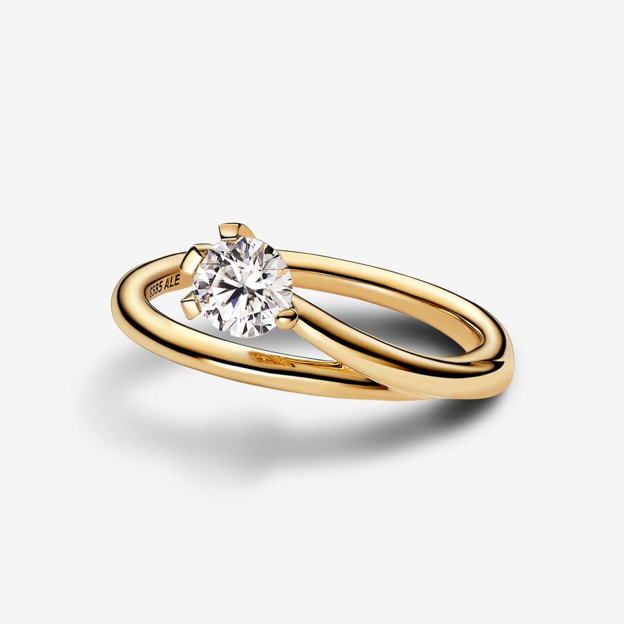 Brilhe no Anel Assimétrico com Moissanite. Inspirado na ilusão de capturar e segurar um precioso fragmento de luz, este luminoso anel de diamante cultivado em laboratório apresenta um Moissanite redondo brilhante de 0,50 quilates em excelente lapidação cultivado em laboratório, ramificando-se da banda do anel para criar um design dinâmico e moderno. Uma cravação assimétrica emoldura a pedra, permitindo a entrada de luz para amplificar seu brilho. Use-o ou presenteie-o como um símbolo da luz única dentro de todos nós.