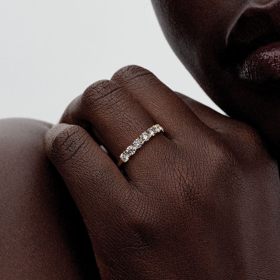 Deixe a luz entrar, com este radiante Anel de Banda Radiante. O Anel é incrustada com uma fileira de nove Moissanites cultivados em laboratório, ajustados à pulseira com configurações de garra que seguram o Moissanites na diagonal, permitindo a máxima refração da luz para realçar o brilho. Esteja você se tratando ou surpreendendo alguém especial, este é um anel para amar por toda a vida.