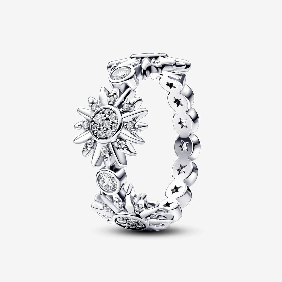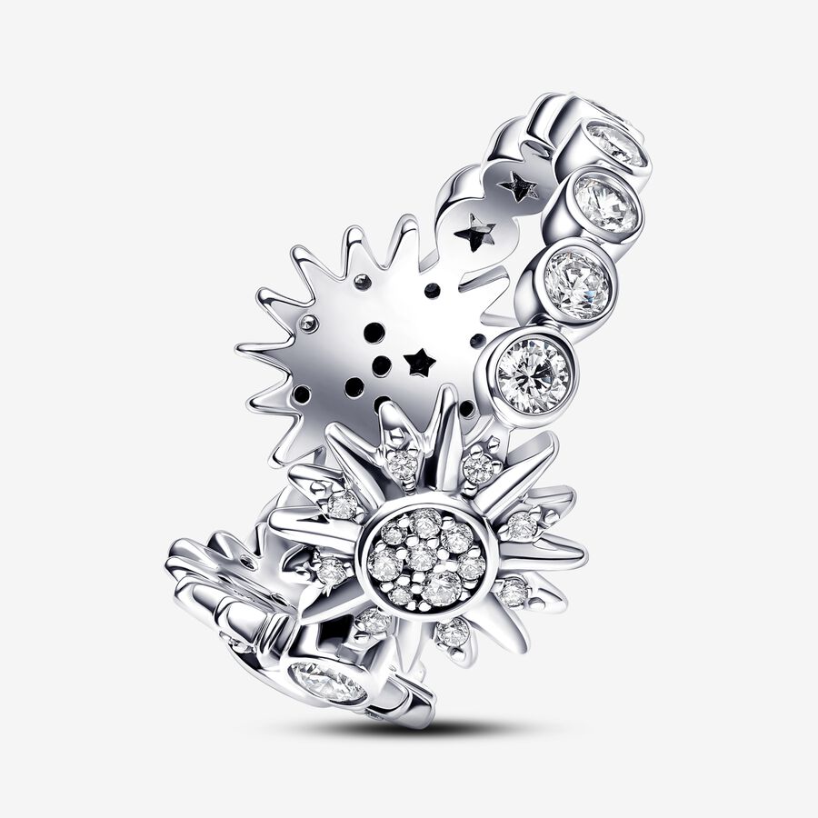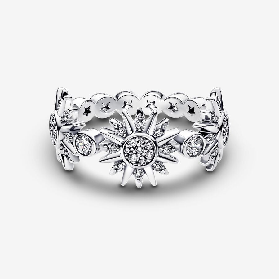 Faça todos os dias radiante com o Anel de Sol Triplo Espumante. Este intrincado anel de prata esterlina apresenta uma faixa com pedras de moldura. No centro, três sóis brilham com pavé e são cercados por raios, metade dos quais são polidos e metade dos quais são definidos com pedras cúbicas de zircônia e micropérolas. Inspirado na beleza brilhante do sol, este anel trará luz e positividade ao seu visual e ao seu humor.