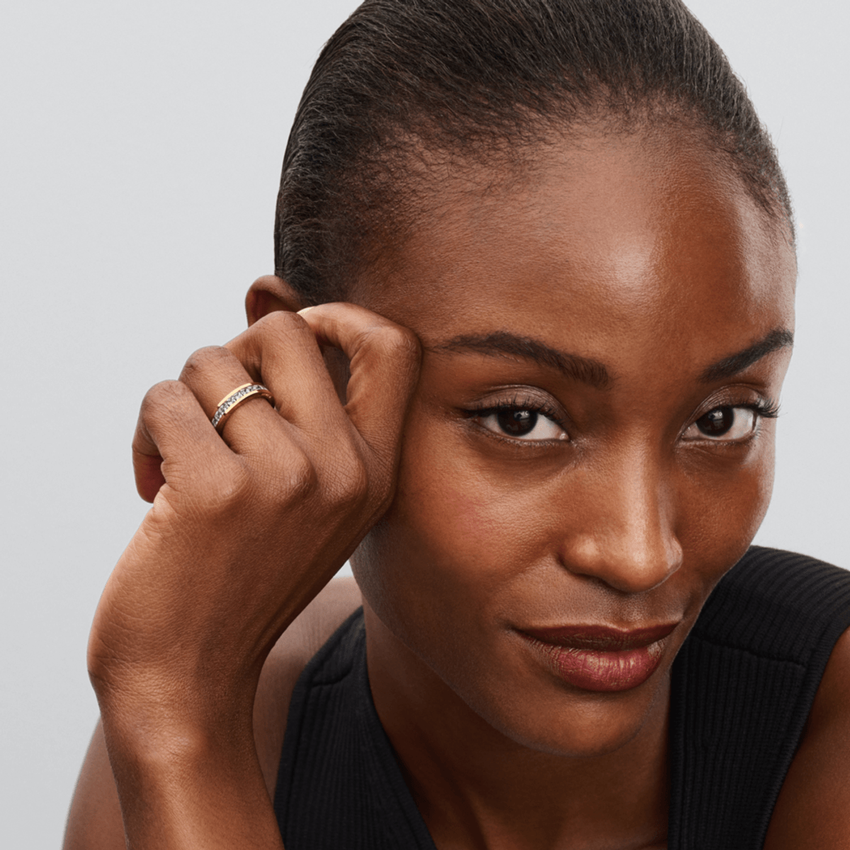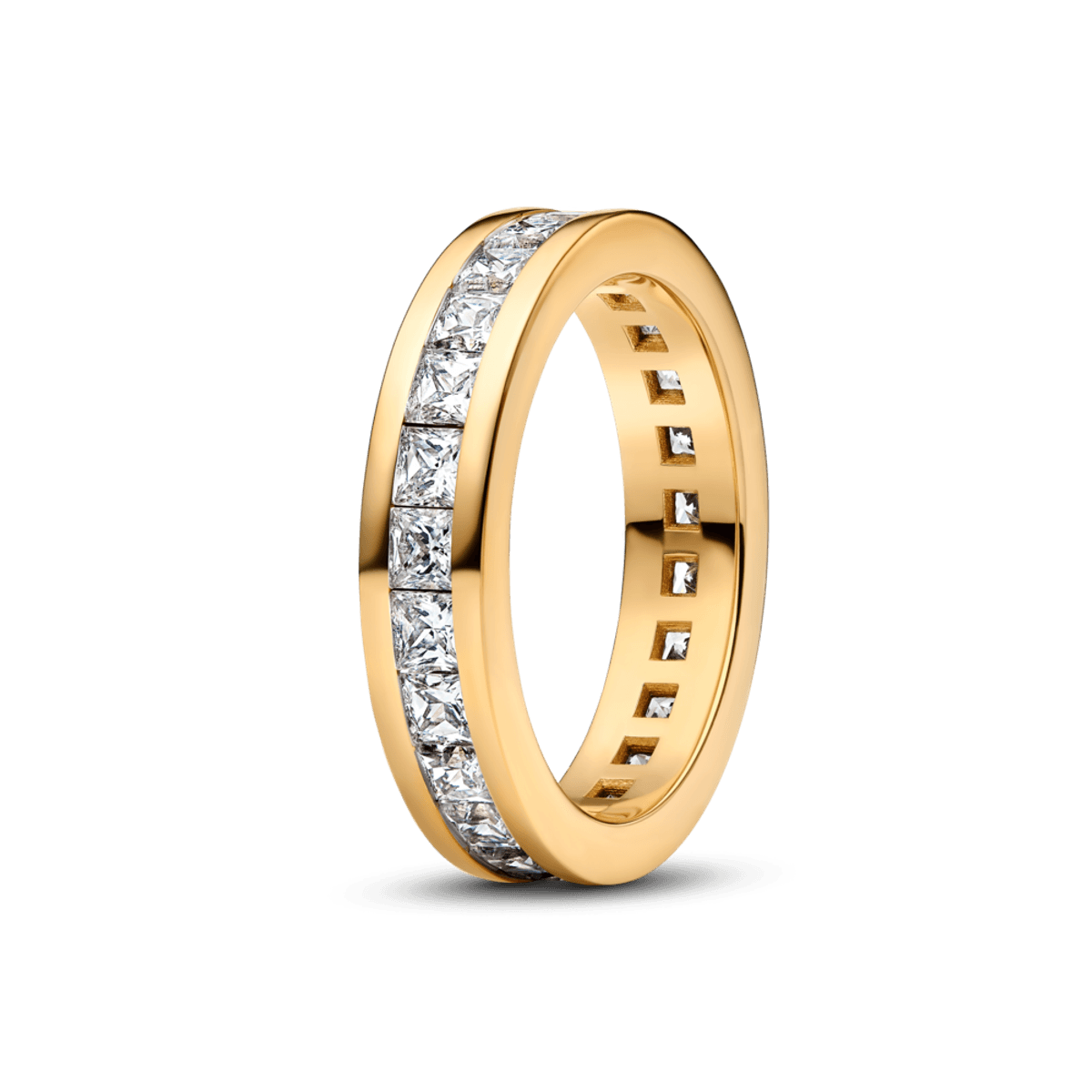 O Anel Feminino Eternidade é banhado a ouro 14k e cravejado com zircônias cúbicas transparentes em toda a sua extensão. Esta joia simboliza um vínculo eterno — perfeito para representar uma história de amor, um compromisso duradouro ou um marco especial. Seu acabamento luxuoso e design sofisticado tornam essa peça uma escolha ideal como anel de compromisso, aliança de ouro feminina ou até mesmo como peça-chave para quem deseja adicionar elegância atemporal ao dia a dia. As zircônias cravejadas com precisão oferecem um brilho intenso, refletindo luz em cada movimento. Além de ser versátil e refinado, esse anel cravejado pode ser usado sozinho ou combinado com outras joias Pandora, criando uma composição única e cheia de significado.