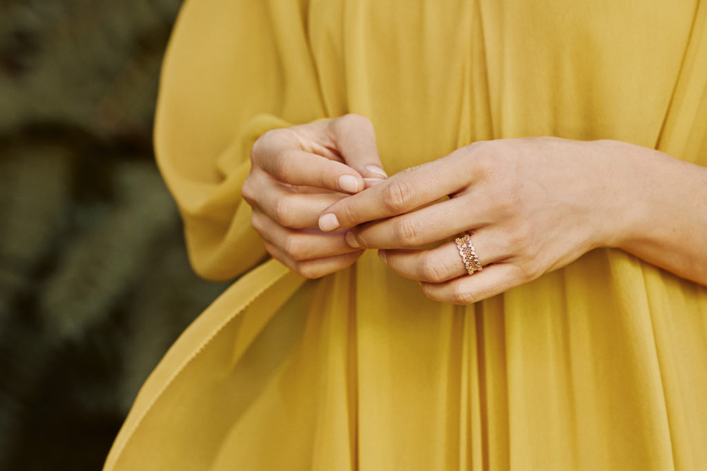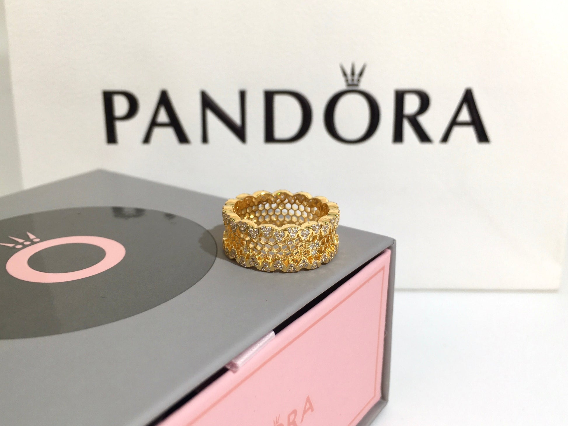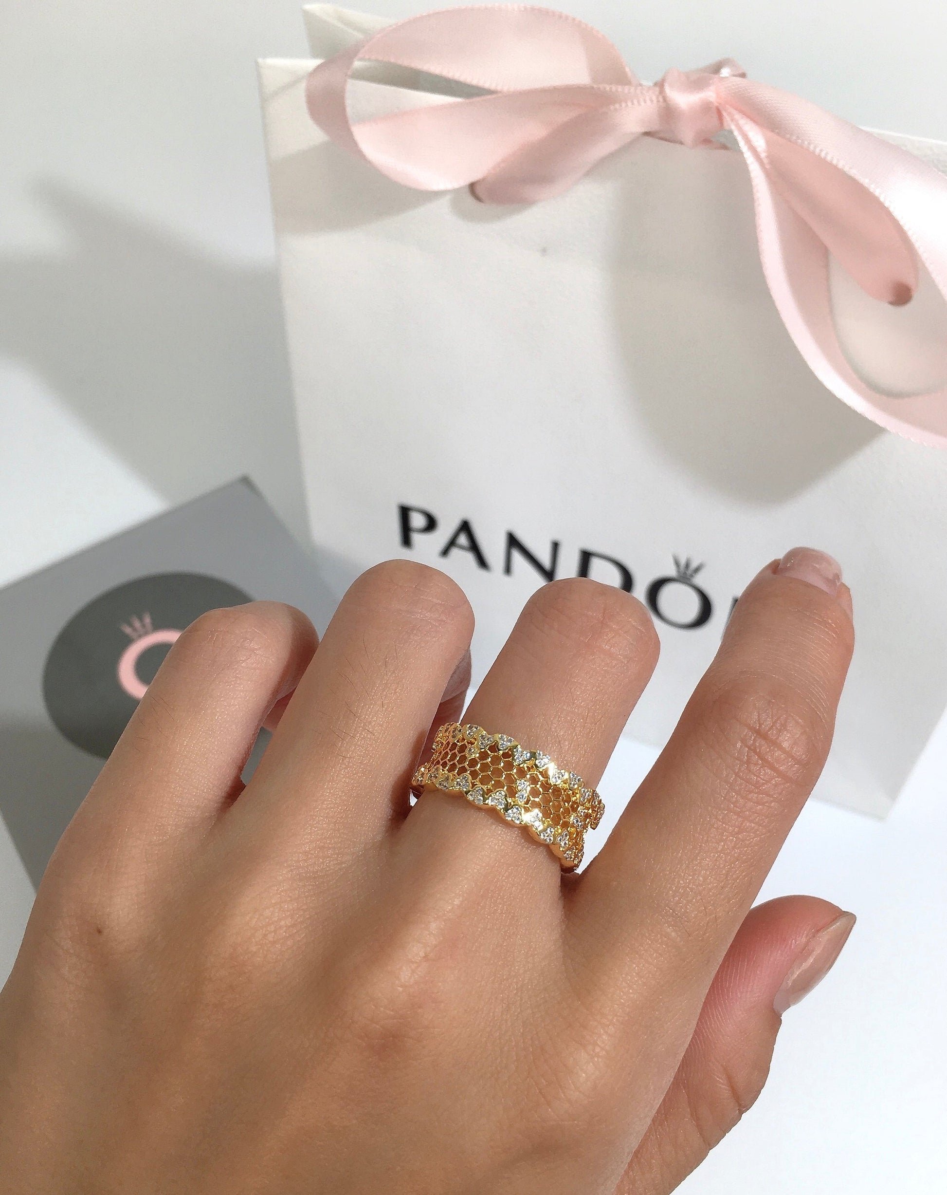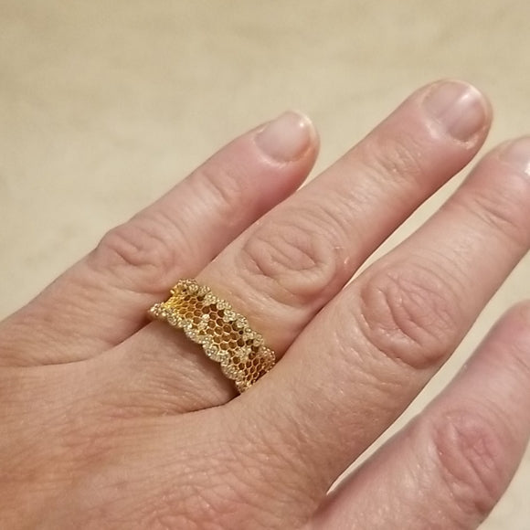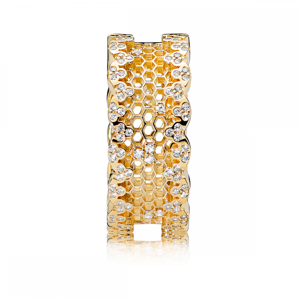 Crie um look suntuoso de renda de colmeia com este expressivo anel em prata 925 com banho em ouro 18k. Mais de 100 pedras transparentes são distribuídas em um padrão aleatório, lembrando gotas de mel sobre a estrutura delicada. Anel com 180 microzircônias cúbicas transparentes com cravação inglesinha e 14 zircônias cúbicas transparentes com cravação em contas.