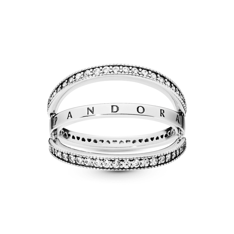 Duas fileiras de pedras transparentes viram de um lado para outro neste versátil anel em prata de lei.