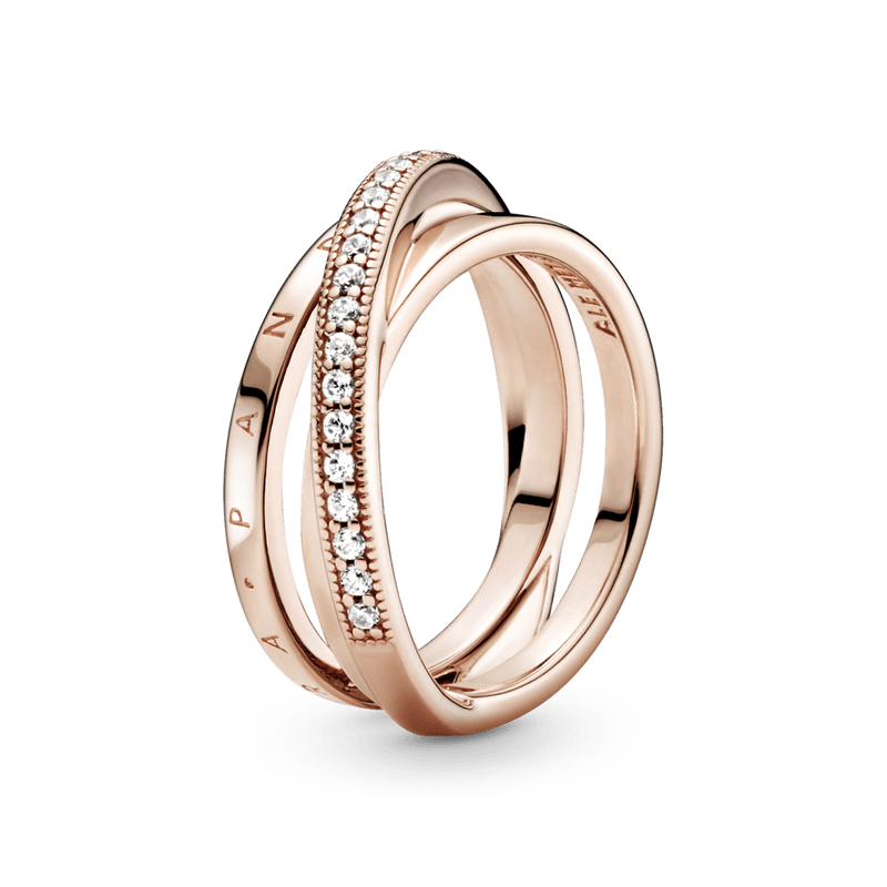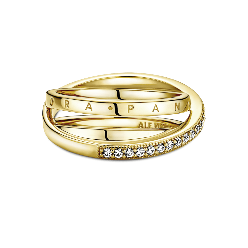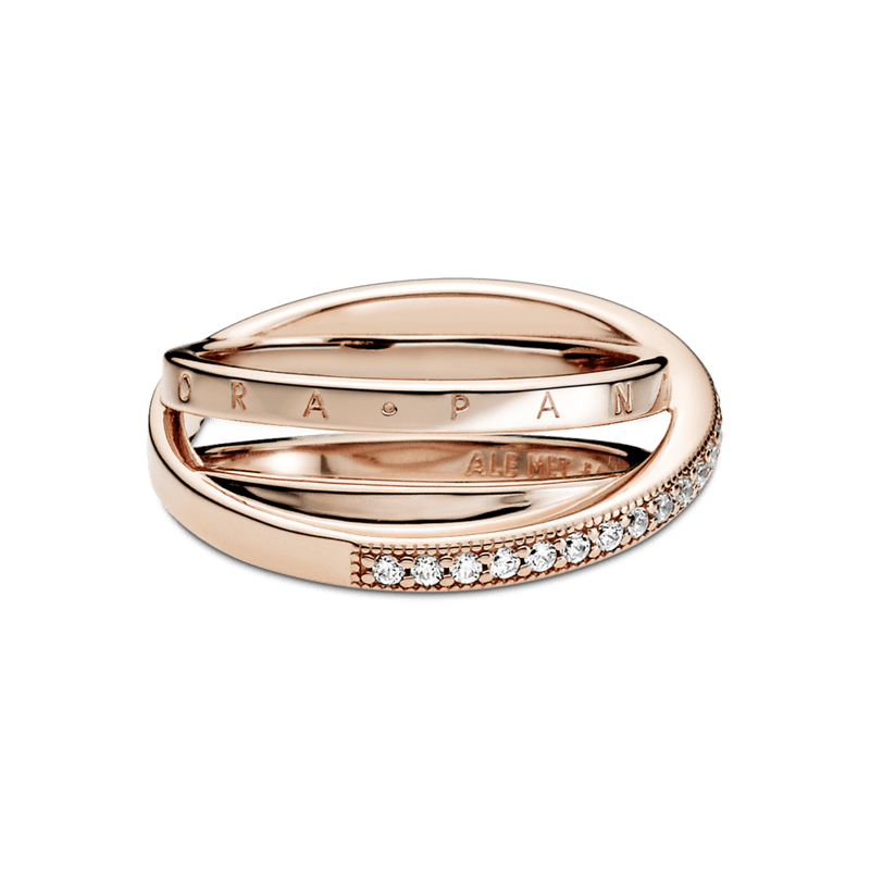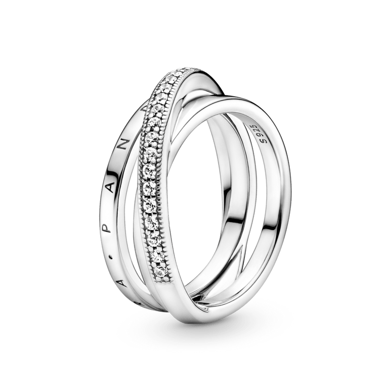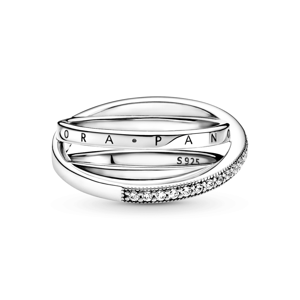 Procure camadas lineares neste anel com uma banda tripla trançada e pavé. O anel, feito de prata 925, tem três faixas, uma das quais se sobrepõe às outras duas na diagonal. A primeira faixa interna apresenta o logotipo Pandora, a outra faixa interna é brilhante, enquanto a faixa externa é decorada com um pavé de pedras cúbicas de zircônia incolor emolduradas por microesferas. Todas as três bandas se fundem na parte de trás do ringue. Inspirado na estrutura em espiral do sistema solar, o anel confere uma elegância sofisticada a cada look.