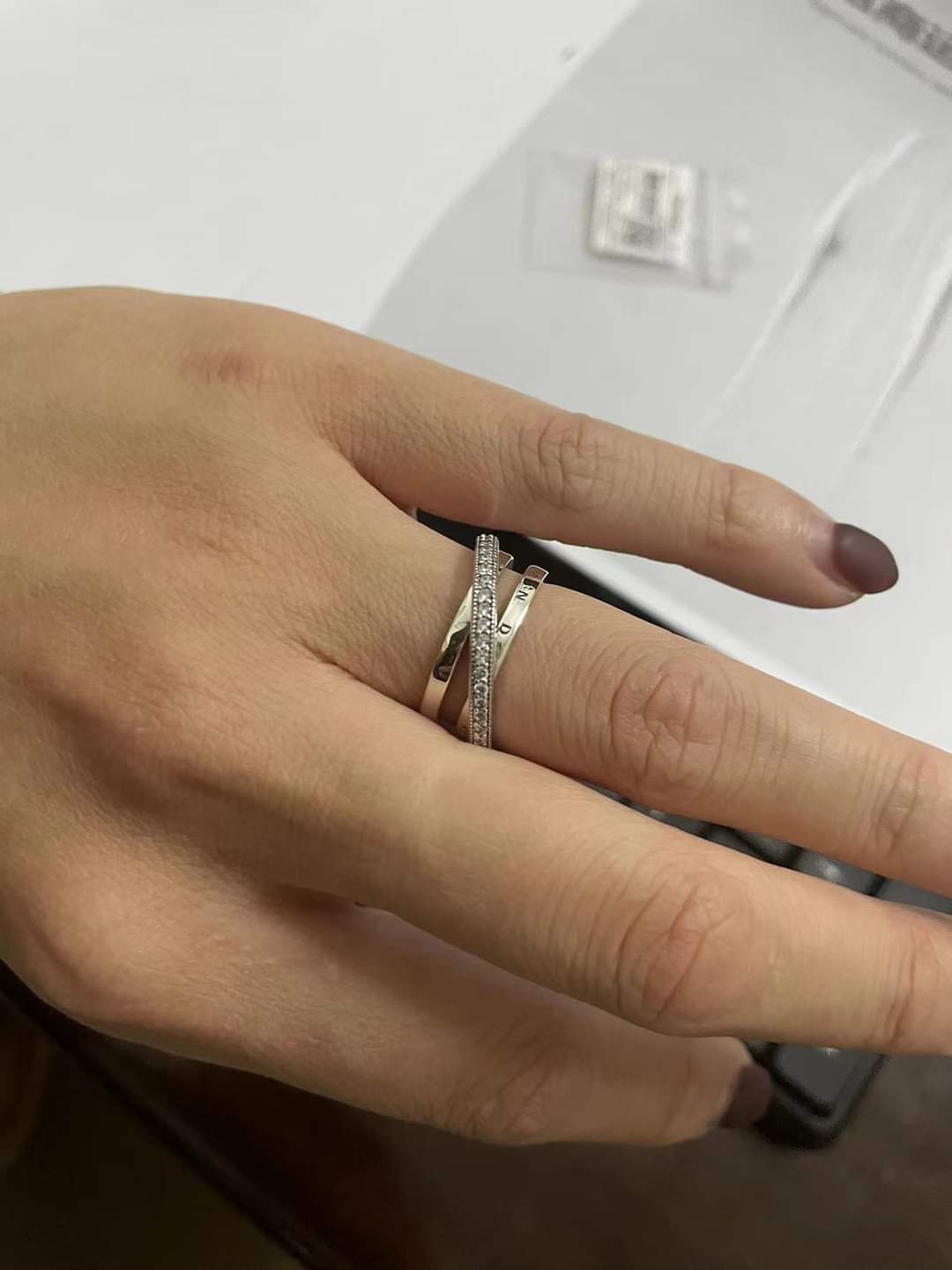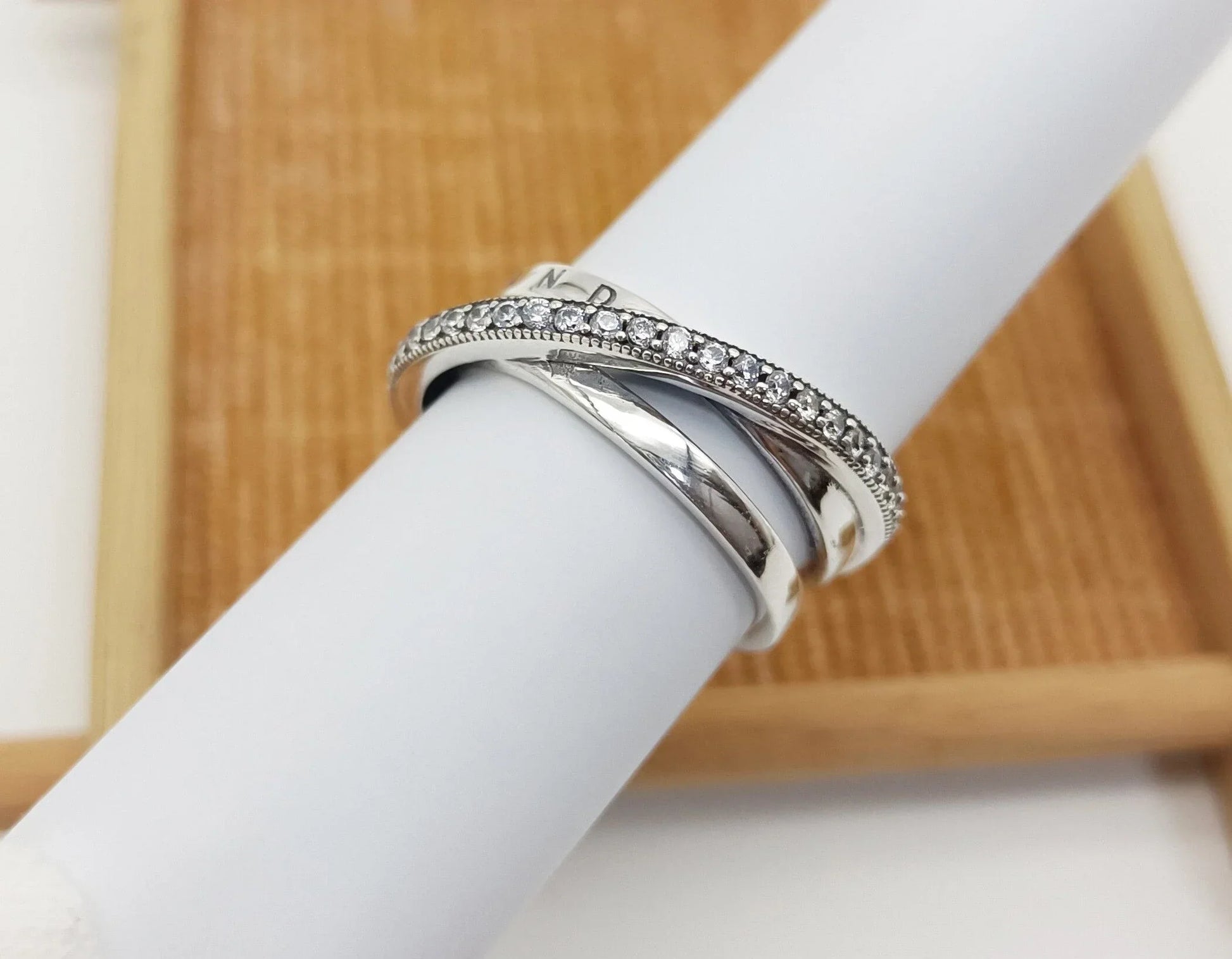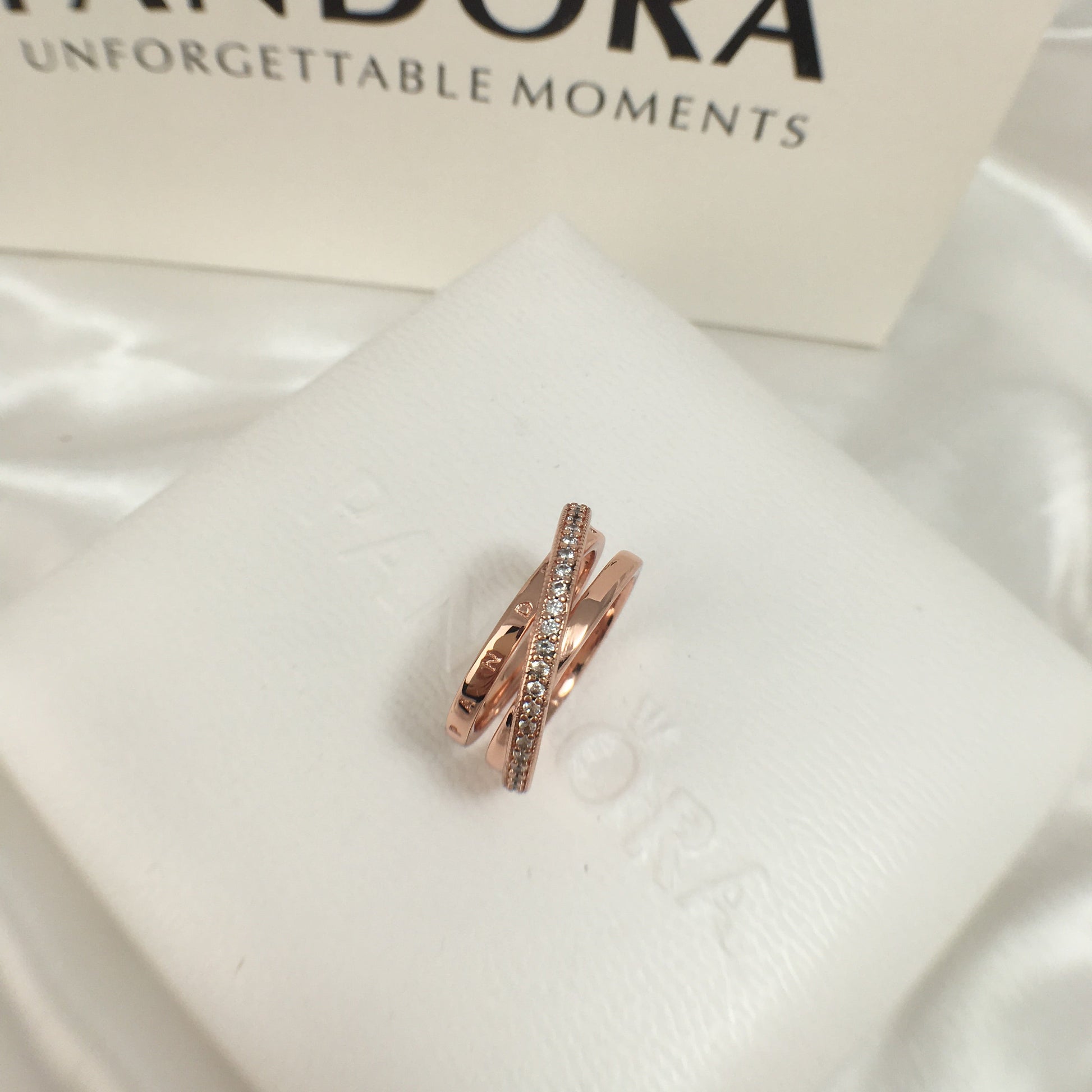 Procure camadas lineares neste anel com uma banda tripla trançada e pavé. O anel, feito de prata 925, tem três faixas, uma das quais se sobrepõe às outras duas na diagonal. A primeira faixa interna apresenta o logotipo Pandora, a outra faixa interna é brilhante, enquanto a faixa externa é decorada com um pavé de pedras cúbicas de zircônia incolor emolduradas por microesferas. Todas as três bandas se fundem na parte de trás do ringue. Inspirado na estrutura em espiral do sistema solar, o anel confere uma elegância sofisticada a cada look.