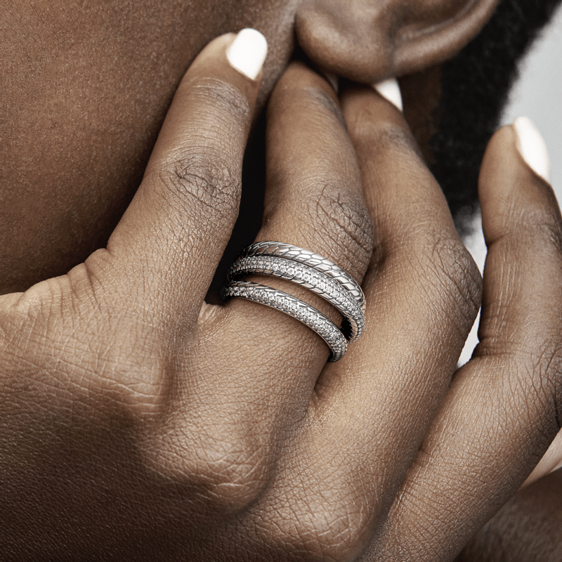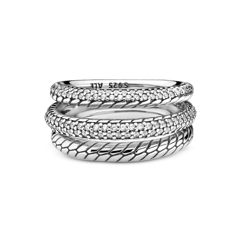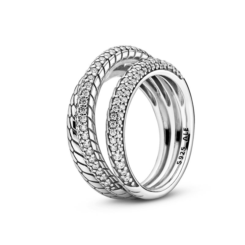 Atraia todos os olhos com este anel de banda tripla com malha e pavé. Inspirado nas pulseiras Link, este anel de banda tripla tem acabamento à mão e é feito de prata esterlina 925 e é decorado com pedras de zircônia cúbica incolores. Um anel é coberto com malha de cobra, o anel do meio superior é totalmente decorado com pedras preciosas, enquanto o terceiro anel exibe uma combinação de ambos os motivos. Adicione brilho ao seu visual com esta joia detalhada.