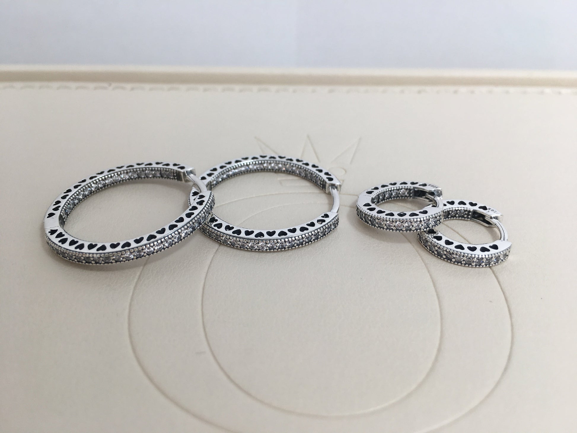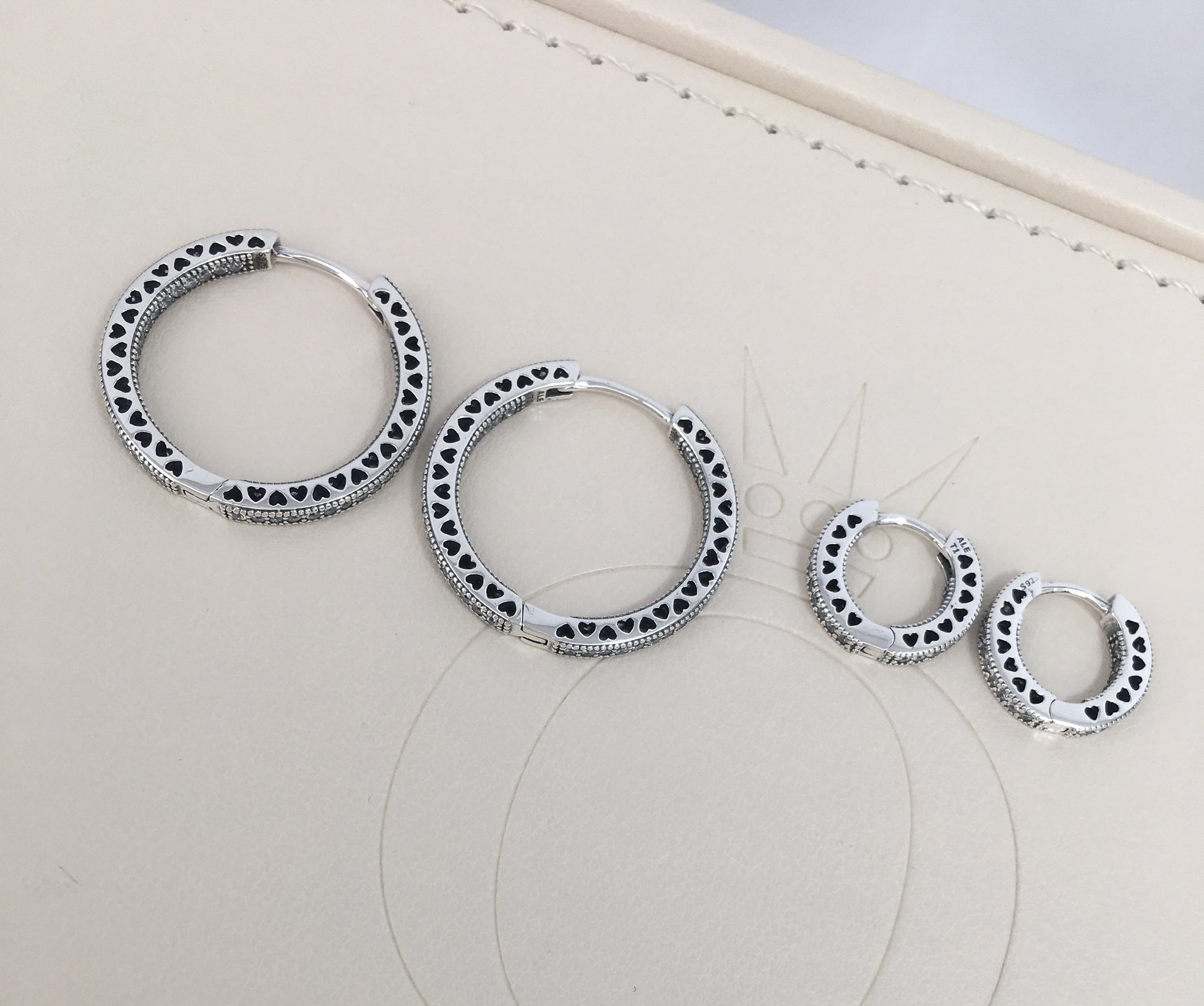 brincos de argola em prata 925 com 64 zircônias cúbicas transparentes com cravação em contas e detalhes de corações vazados, 15 mm.