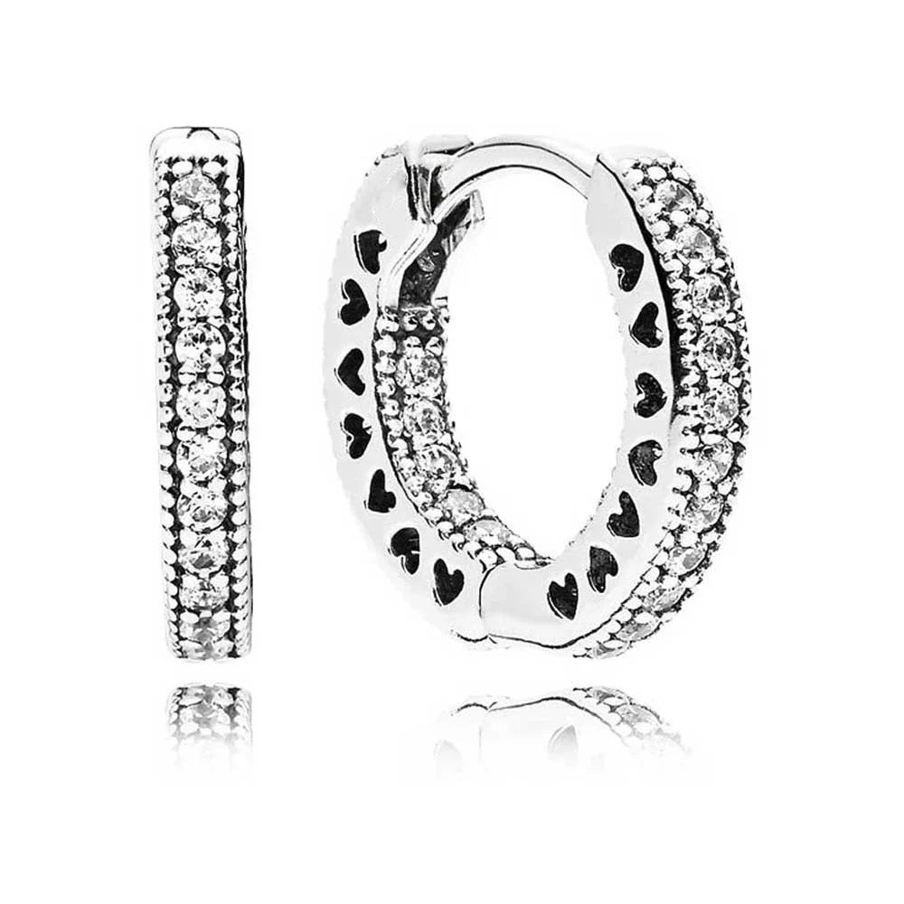 As argolas clássicas ganham um toque contemporâneo com a adição de pontos transparentes brilhantes e corações vazados. o tamanho deles e a prata 925 os tornam itens coringa para toda mulher.