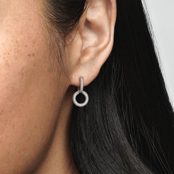Dois é melhor do que um com os brincos de aro duplo espumante. Com acabamento à mão em prata esterlina, esses aros apresentam dois círculos do mesmo tamanho ligados com fileiras de pavé de zircônia cúbica transparente com conjunto de contas. Micro-beading, corações em relevo e o logotipo adicionam detalhes ainda mais intrincados a esses brincos de argola pendentes, que balançam na metade inferior, dando-lhes um movimento adorável. Use-os para uma saída à noite ou para adicionar um toque polido ao seu look diurno.