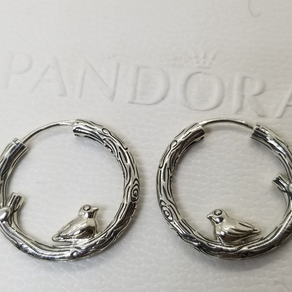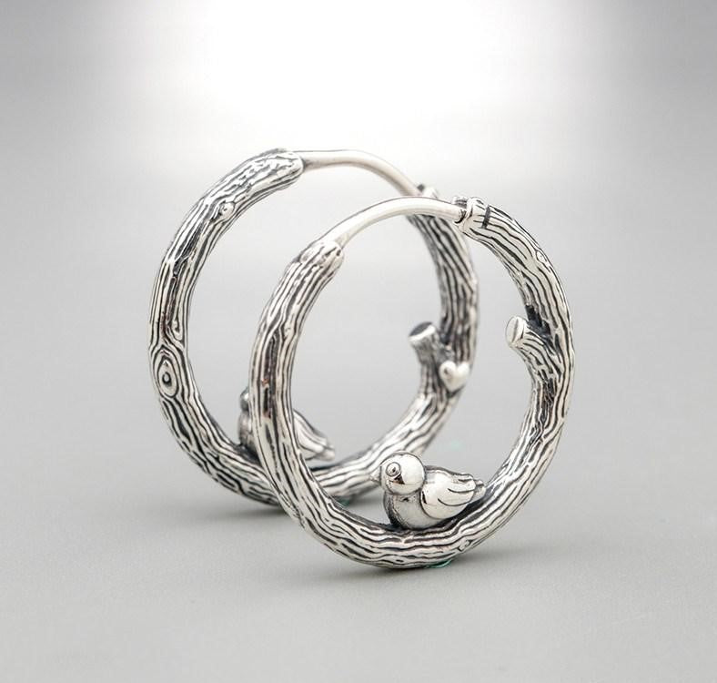 Texturas elegantes inspiradas na natureza e na beleza do canto dos pássaros brilham intensamente nestes brincos de argola fabricados com requinte em prata 925. Deixe-os se expressar lindamente em suas orelhas. Brincos de argola em prata de lei com detalhe de pássaro.