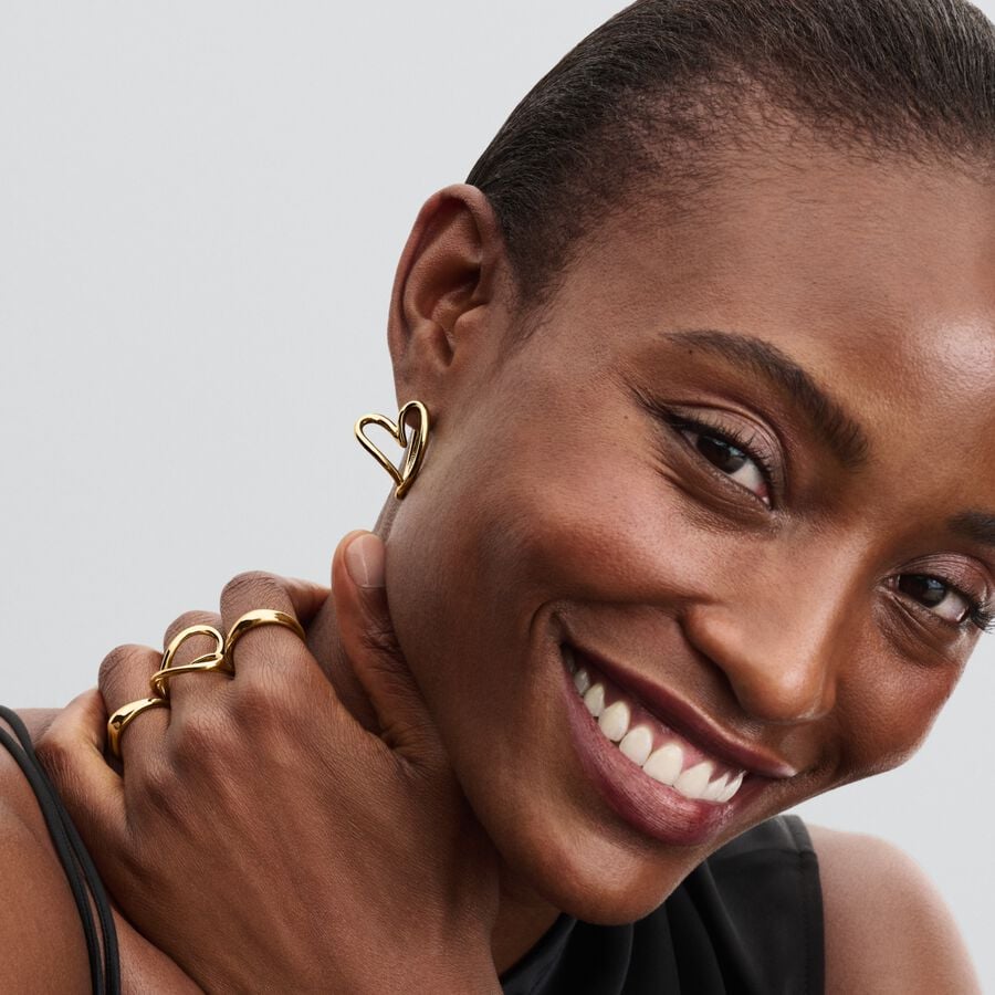 O amor está em sua natureza. Estes brincos de argola de formato orgânico apresentam corações abertos abstratos em banho de ouro 14k, inspirados nas formas fluidas do mundo natural. Os brincos são vendidos como um par e espelham um ao outro. Um simples fecho de clique torna-os fáceis de usar. Combine-os com a pulseira e o anel correspondentes para uma versão moderna de um símbolo duradouro de amor.