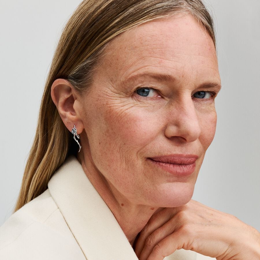 Ecoando graciosamente a elegância da natureza, os Brincos Rosa em Flor Curvos dançam com arte em prata de lei. Um caule sinuoso, adornado com espinhos esporádicos, ascende a uma rosa em flor feita de pétalas em camadas. O design espelha inteligentemente, criando uma versão esquerda e direita, e protegido com costas borboleta em forma de coração. Além do adorno, esses brincos incorporam a beleza ousada dos espinhos de uma rosa, oferecendo uma homenagem tridimensional ao símbolo atemporal do amor. Delicados, mas ousados, eles capturam a essência de presentear uma rosa florescente. Vendido como um par querido.