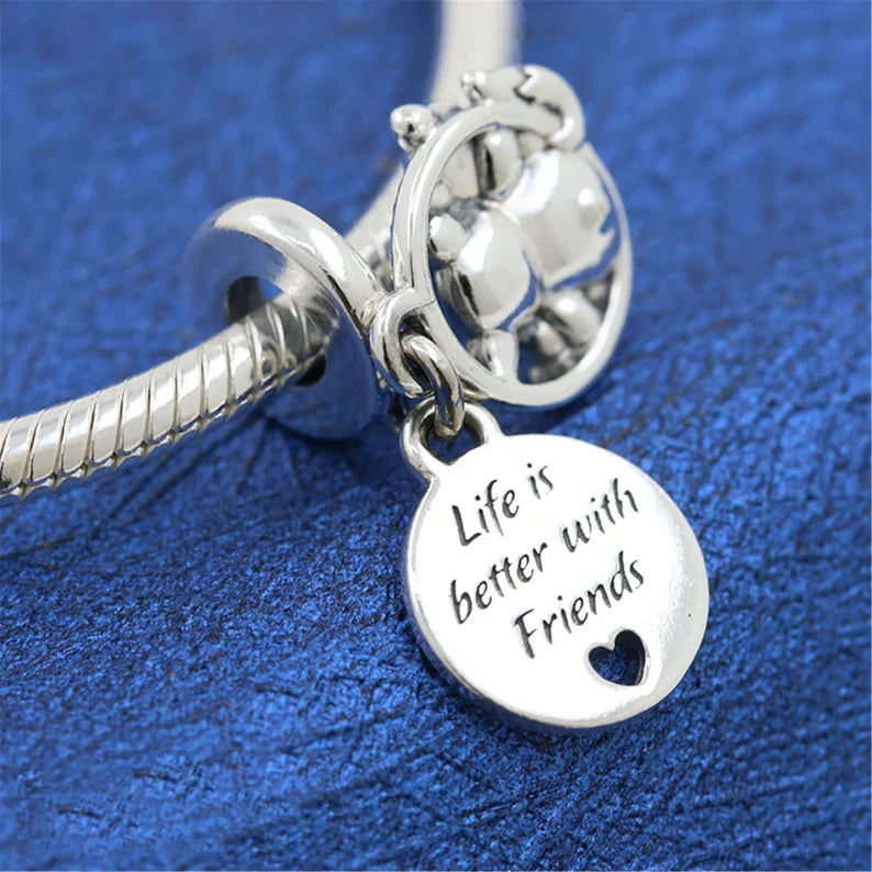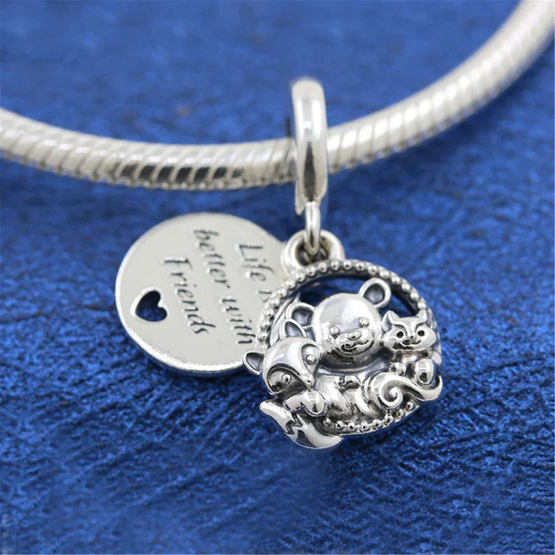 O charm em prata 925 Amigos da Floresta é moderno e tem uma de suas histórias favoritas ao seu look. Uma joia única, perfeita para todos os tempos. Leve seus amigos da floresta com você onde quer que vá com o Urso, Raposa e Esquilo. Com acabamento manual em prata 925, esta peça apresenta um design de dupla balança. O disco frontal apresenta uma raposa tridimensional, urso e esquilo sentados dentro de um círculo de contas. No disco traseiro, há um pequeno coração recortado e a gravura: Life is better with Friends", "A vida é melhor com amigos". Nunca fique sem seus amigos que habitam pinheiros com esse doce charme de balançar.