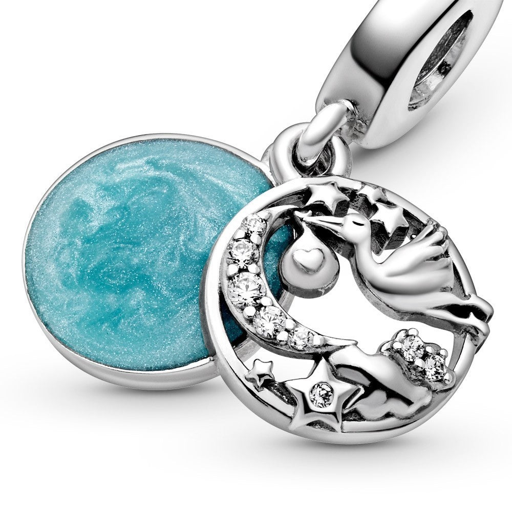 Comemore a entrada de um bebé no mundo, com uma conta pendente dupla especial em prata. O pendente frontal apresenta uma cegonha a transportar uma pequena trouxa num céu estrelado, adornado com zircónias brilhantes. O pendente posterior apresenta esmalte azul claro brilhante e a inscrição “Twinkle twinkle little star do you know how loved you are?” gravada atrás. Este pendente é o presente perfeito para novos pais.