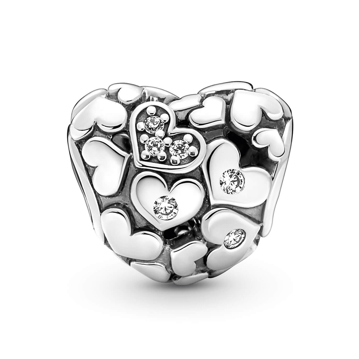 Nosso Charm Coração a Céu Aberto Cintilante se assemelha a corações explodindo de amor. Acabado à mão em prata de lei, este design romântico apresenta zircônias cúbicas redondas com lapidação brilhante que fazem os pequenos corações brilharem ainda mais.