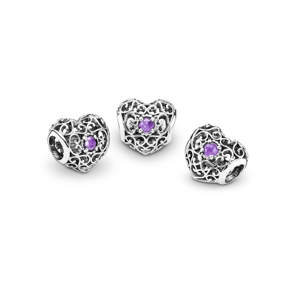Para comemorar os aniversariantes do mes de fevereiro, charm em prata 925 em forma de coração com zircônia cubica roxa.