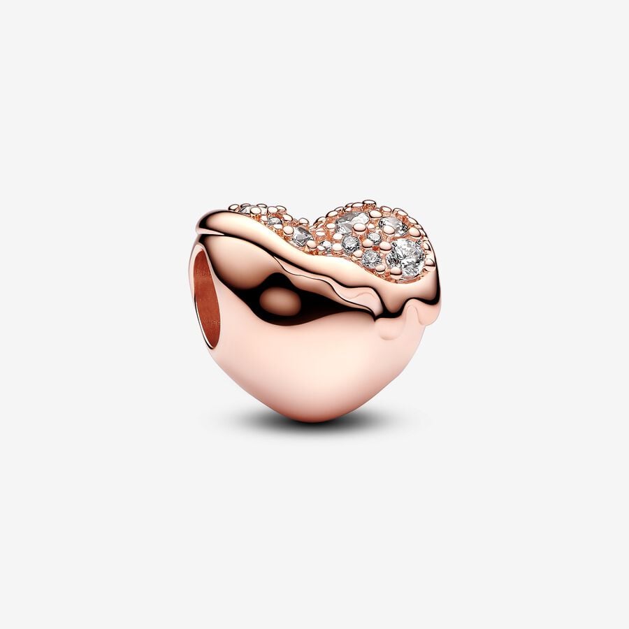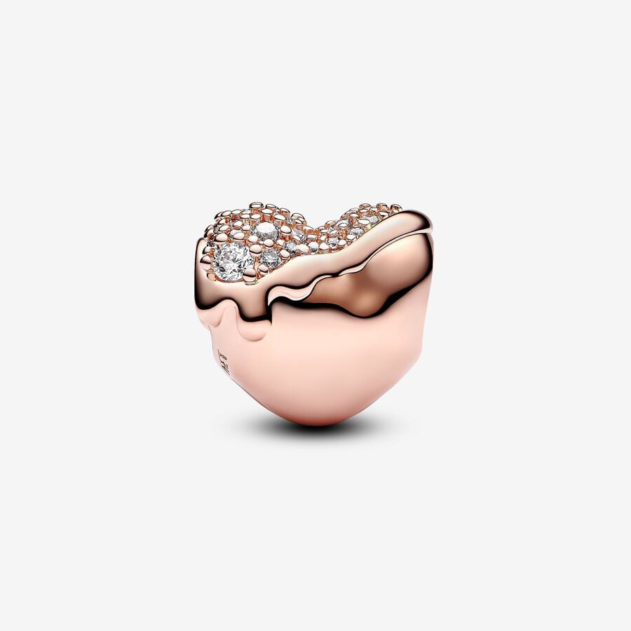 Celebre o amor que faz seu coração derreter com nosso Charm Coração Derretendo banhado a ouro rosa 14k. Um aglomerado de pavê espumante é colocado em cima do metal derretido em ambos os lados do coração.