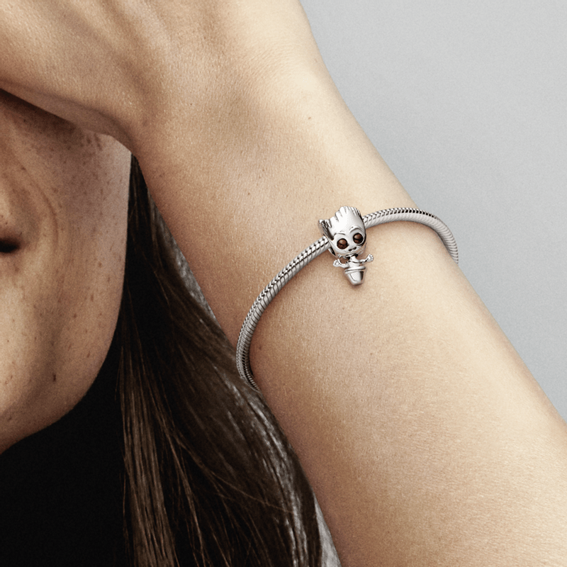 Balançando de um lado para o outro em seu vaso de flores, Groot é trabalhado em prata 925 com cristais castanhos definidos como seus olhos e detalhes sulcados e semelhantes a cascas como seus cabelos e sobrancelhas. A única coisa que ele diz: "I AM GROOT" "EU SOU GROOT" está gravada na parte de trás de sua cabeça. Adicione este charme à sua coleção como um símbolo da sua capacidade de crescer mais forte a cada dia.