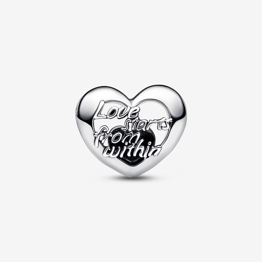 Cerque-se de amor com nosso Openwork Heart & Script Charm. Este pingente de prata de lei apresenta um pequeno coração polido dentro de um grande coração vazado de um lado e a mensagem "O amor começa de dentro" do outro. Estilize-o com mais charms que inspiram sua jornada de amor próprio.