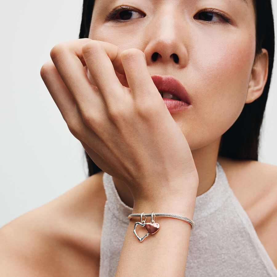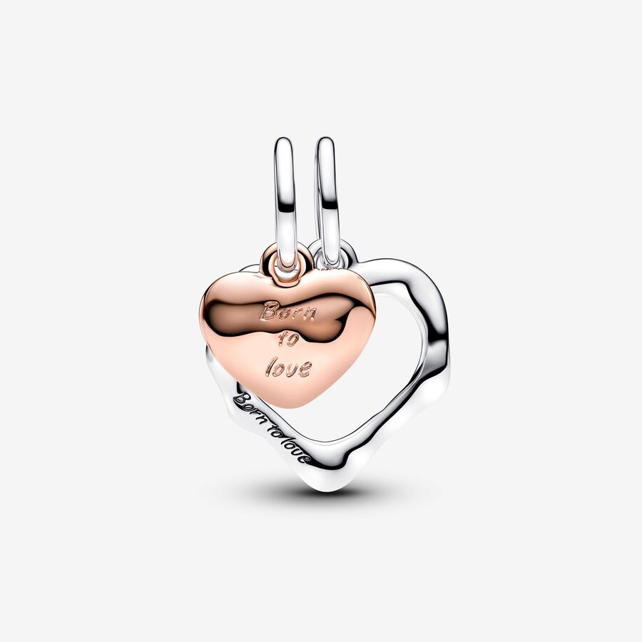 Este pingente de coração compartilhável tem duas peças - um pendente de coração menor em banho de ouro rosa 14k e um coração recortado maior em prata esterlina. Ambos apresentam uma estética fluida e derretida, simbolizando o encontro e a fusão de dois corações. Cada um está gravado com "BORN TO LOVE" "Nascido para amar". Use as duas peças juntas ou compartilhe-as com quem você nasceu para amar.