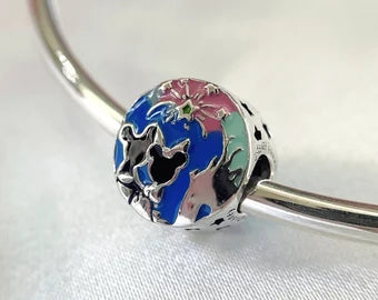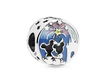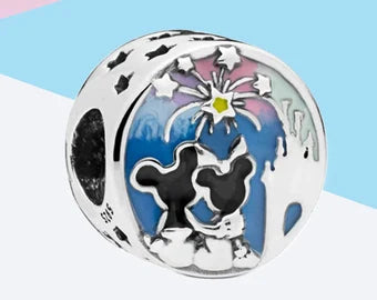 Aproveite as memórias de assistir aos fogos de artifício na Disney com o lindo charme Happily Ever After. Mickey e Minnie se aninham juntos de frente para o castelo com estrelas prateadas e amarelas explodindo em um céu colorido. Pequenas estrelas recortadas decoram a lateral do pingente.