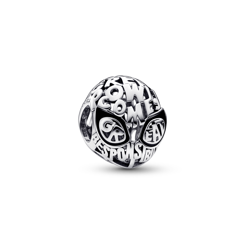 o Charm retrata a máscara do Homem-Aranha e tem a inscrição "With great power comes great responsability", "Com grande poder vem grande responsividade". As joias do Homem-Aranha são de prata esterlina, é adornada com esmalte vermelho da fantasia do Homem-Aranha. Por exemplo, você pode combinar um pingente com uma pulseira, colar ou chaveiro, e criar uma peça de joias do Homem-Aranha que é perfeita para você.