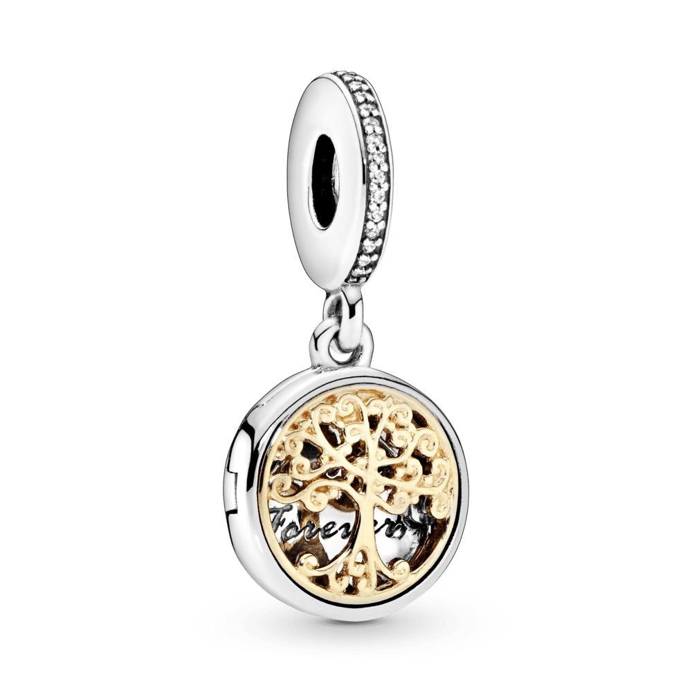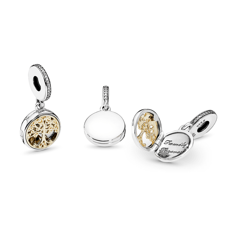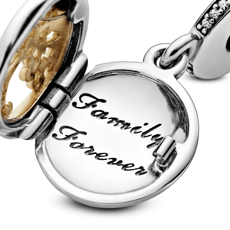 Este locket em dois tons no estilo vintage apresenta uma magnífica árvore genealógica em ouro 14k precioso, com a gravação “Family Forever” (Família para sempre). Com sua homenagem aos estilos tradicionais e uma linda execução, ele é um tributo requintado às famílias.