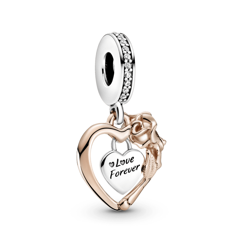 Transmita uma mensagem de amor com o Charm Pendente Flor Rosa E Coracao. Com acabamento à mão em prata 925 e folheado a ouro rosa 14k, este design inclui uma moldura em forma de coração com um cadeado pendurado dentro dela. A moldura apresenta detalhes intrincados de pétalas de rosa e folhas, enquanto o cadeado inclui a gravação “Amor para sempre” e pedras cintilantes decoram a fiança. Inspirado na peça Romeu e Julieta de William Shakespeare, presenteie esta peça para quem tem o seu coração.