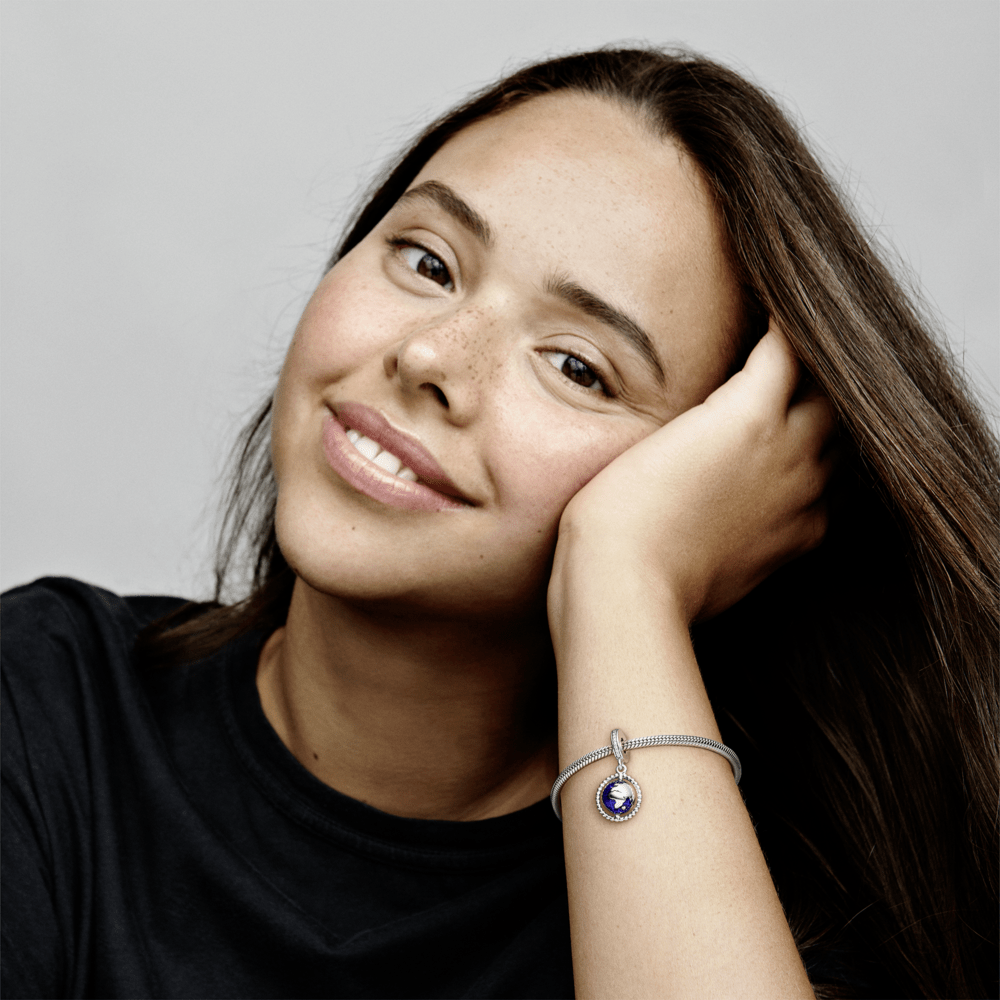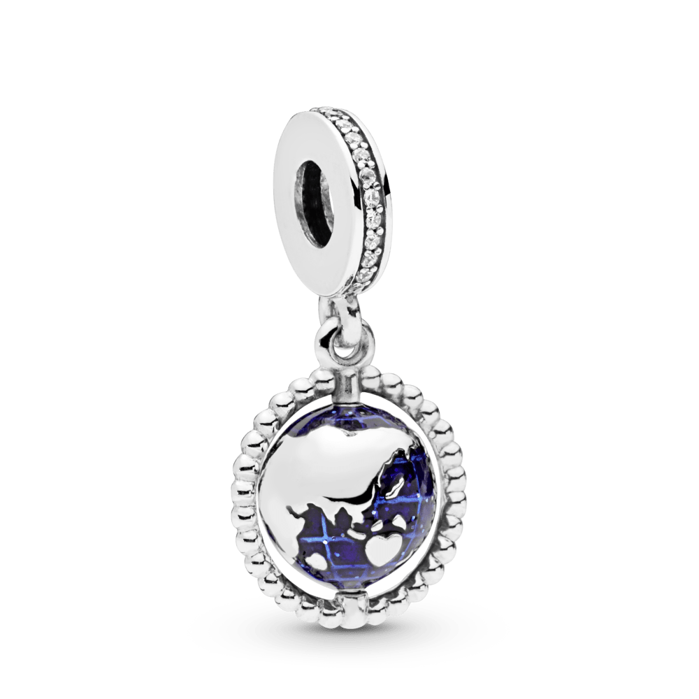 Deixe o seu amor por viagens moldar o seu estilo com este encanto de globo. A peça acabada à mão tem o formato da Terra e gira em seu eixo de contas. O charme globo apresenta esmalte azul cintilante aplicado à mão para um acabamento semelhante à água. Use em sua pulseira favorita junto com outros berloques inspirados em viagens que canalizam seu desejo de viajar para um visual viajante