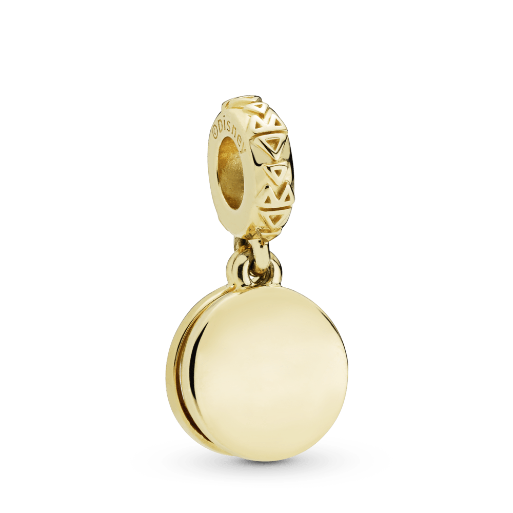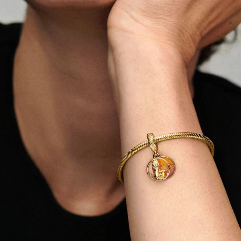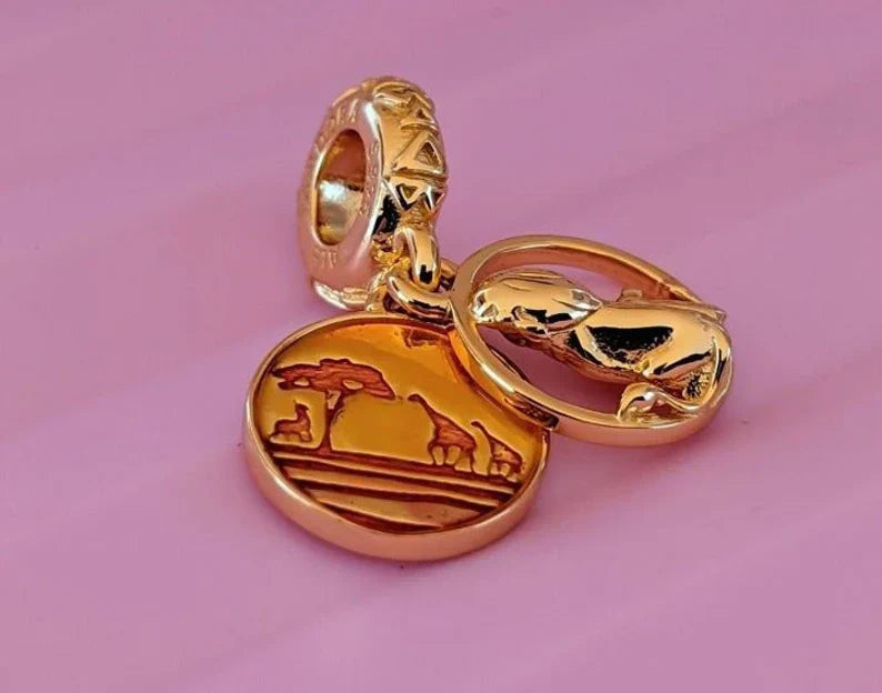 Tons gloriosos de ouro são as cores de assinatura para o filme e o acabamento banhado a ouro de 18k elogia lindamente os detalhes do esmalte âmbar. Em um disco, Mufasa e Simba sentam-se juntos vendo seu Reino, tudo o que a luz toca. O segundo disco balança atrás exibindo uma cena de savana com árvores altas e girafas elegantes. Um interessante padrão hieróglifo adorna o fardo do charme.