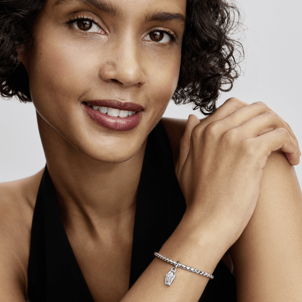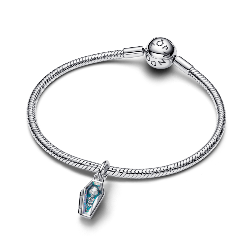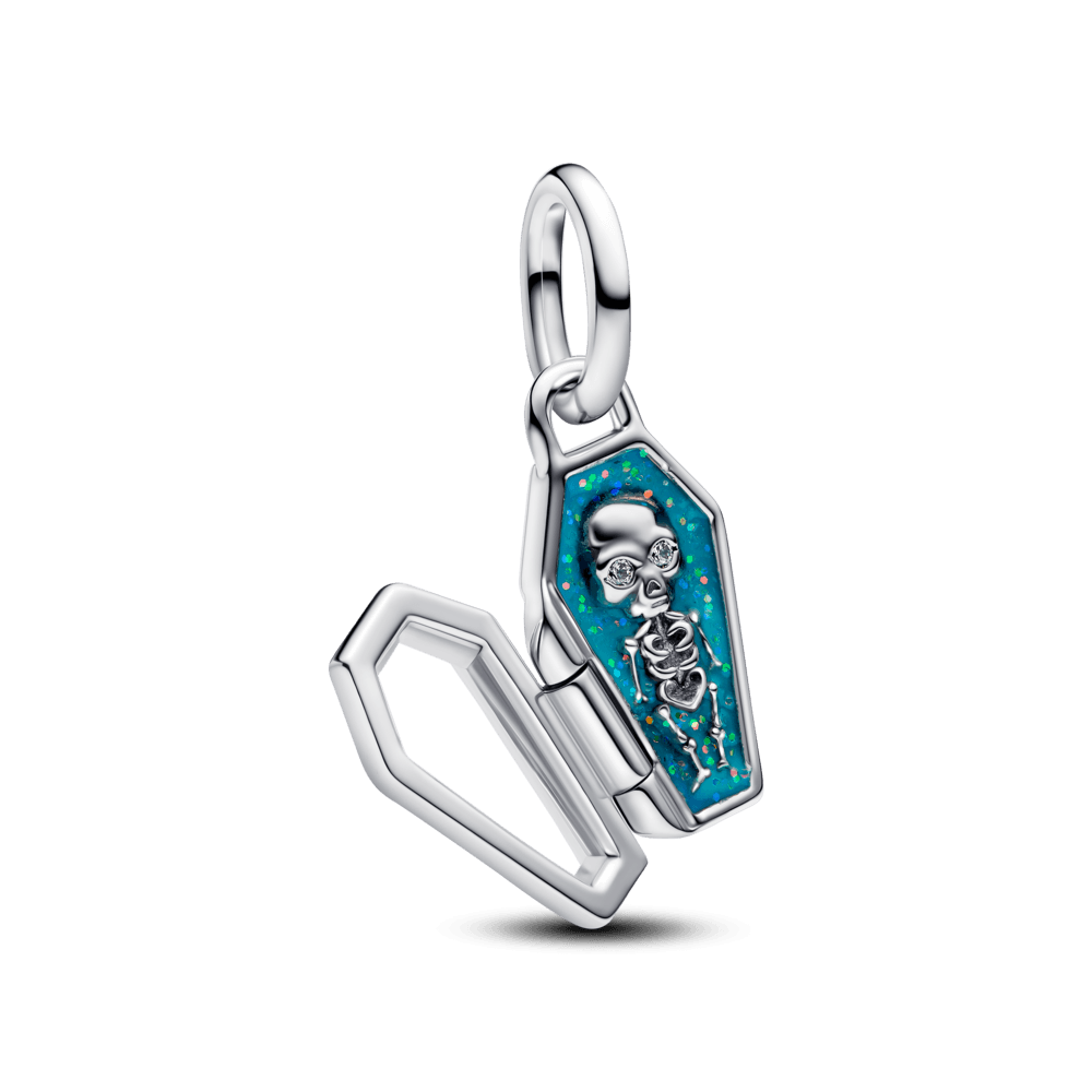 Desperte sua personalidade mais ousada com o charm pendente de caixão Pandora em prata esterlina. A peça articulada revela um esqueleto sobre fundo brilhante que brilha no escuro e guarda a mensagem secreta "yours forever". Um pingente enigmático e divertido, perfeito para quem ama Halloween, símbolos góticos ou quer carregar uma declaração romântica inesperada. Ideal para dar um toque irreverente à sua coleção!
