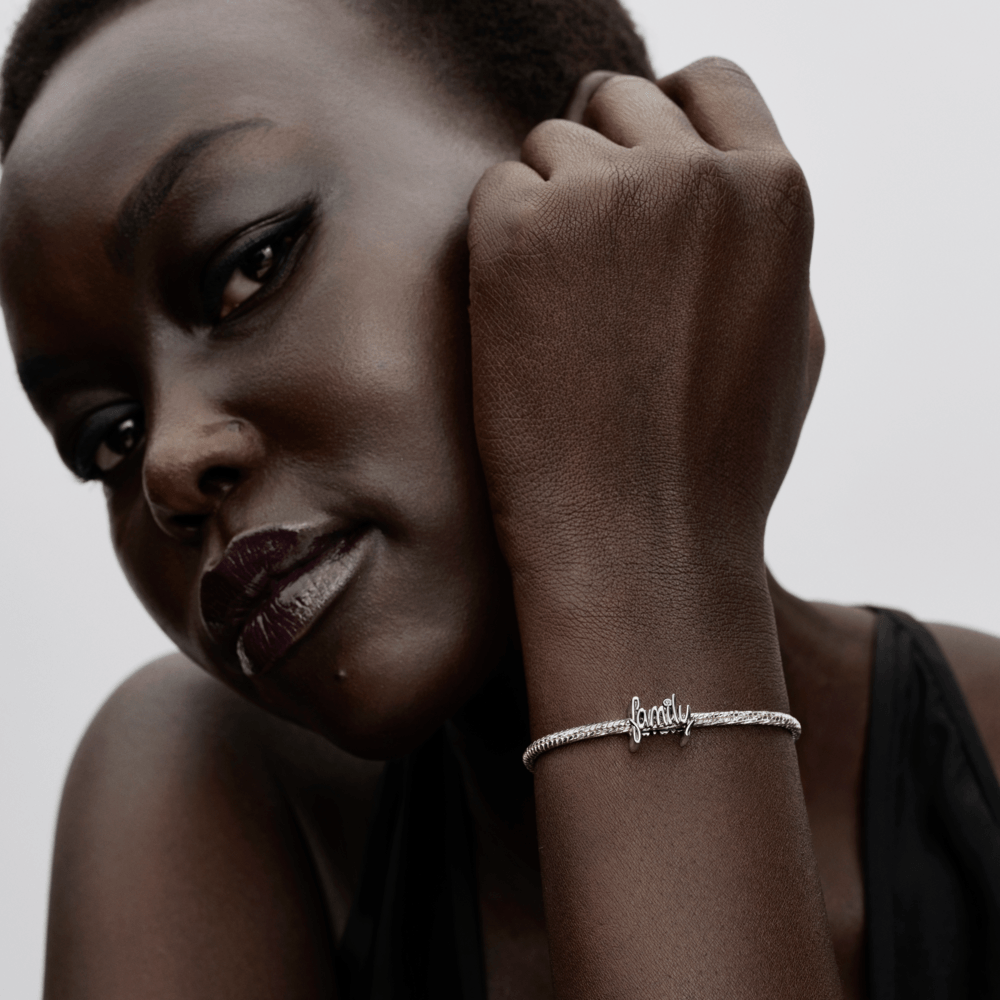 O Charm Família Brilhante Pandora expressa a força dos laços familiares. Com acabamento manual em prata de lei, o design apresenta a palavra “family” escrita em um elegante estilo manuscrito, transmitindo ternura e conexão. O ponto sobre a letra “i” é adornado por uma zircônia cúbica transparente, adicionando um toque de luz à joia. Este charm é um lembrete delicado de que a família é o coração de cada capítulo da vida — uma peça cheia de significado para carregar perto de quem você ama.