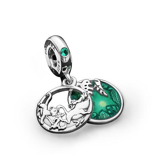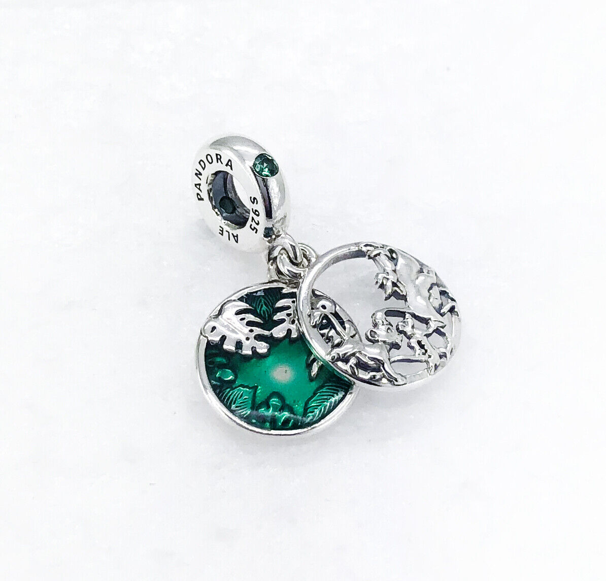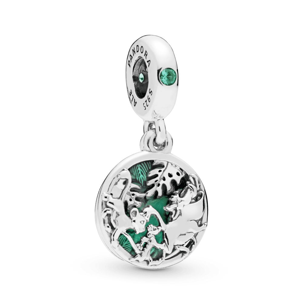 Hakuna matata é a frase perfeita para descrever o novo cCharm Simba, Timão e Pumba. O trio de amigos entra na fila em um pedaço deste delicioso charme de balançar. Um disco separado está pendurado atrás deles representando uma cena de selva em esmalte verde florestal. Duas pedras de zircônia verde combinando adornam ambos os lados do fardo do charme e duas folhas são em relevo na parte de trás do charme.