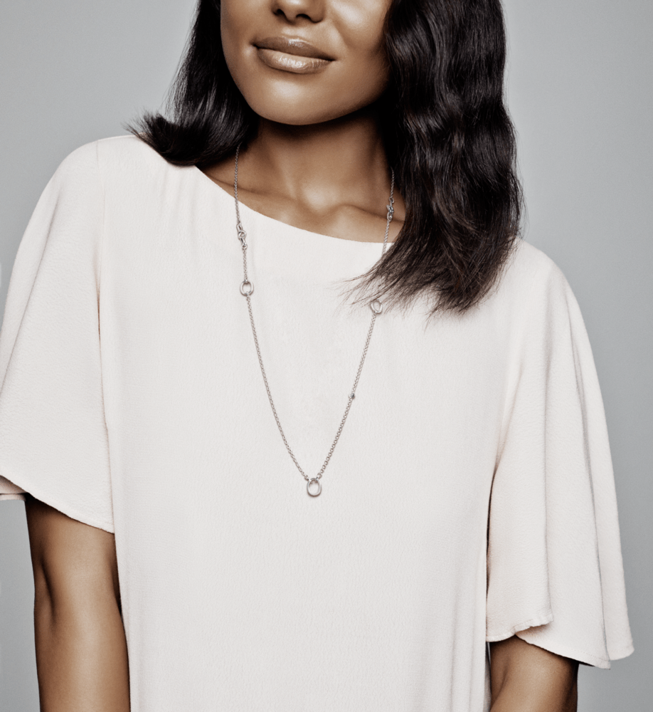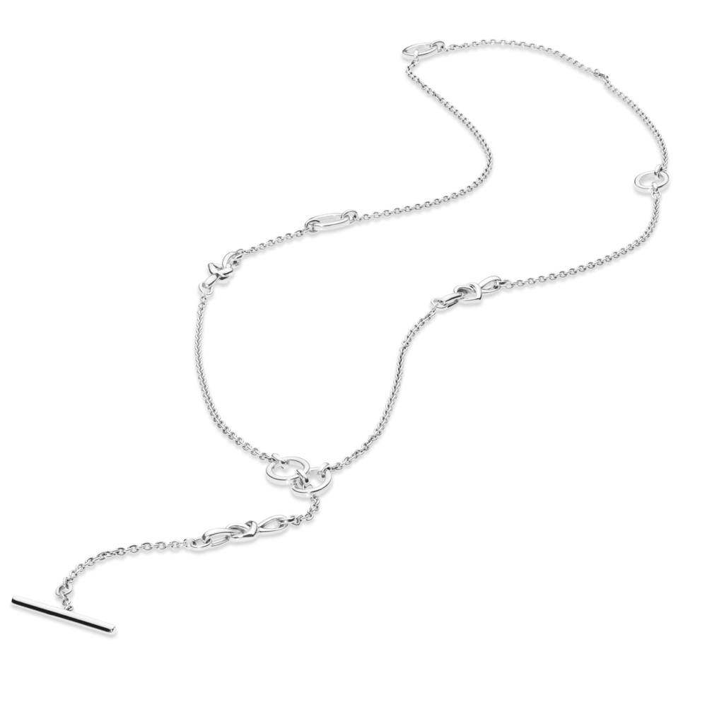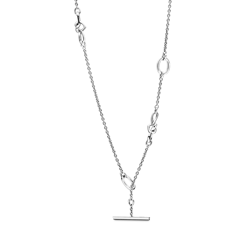 Faça uma declaração ousada de amor moderno com este colar T-bar em prata de lei. A corrente robusta apresenta elos de declaração, em forma de corações com nós e grandes formas ovais que lembram a coroa Pandora O. Ajuste a barra em T para usar de várias maneiras. Colar de prata com fecho T, de 90cm ajustável a vários tamanhos.