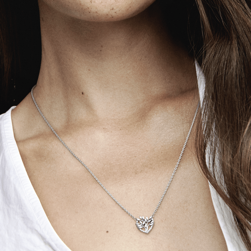 Mantenha as pessoas queridas por perto com a gargantilha Coração e árvore da família. Finalizada à mão em prata de lei, o contorno deste pingente ornamental em formato de coração é decorado com pedras brilhantes e transparentes. Nosso icônico motivo da árvore da família aninha-se lá dentro e conta com detalhes de folhas polidas. Inclui um fecho deslizante para fazer o ajuste e há um detalhe de ramo de folhas decorado com uma única pedra preso na extremidade da corrente. Use esta peça cheia de detalhes para se lembrar das suas conexões especiais.