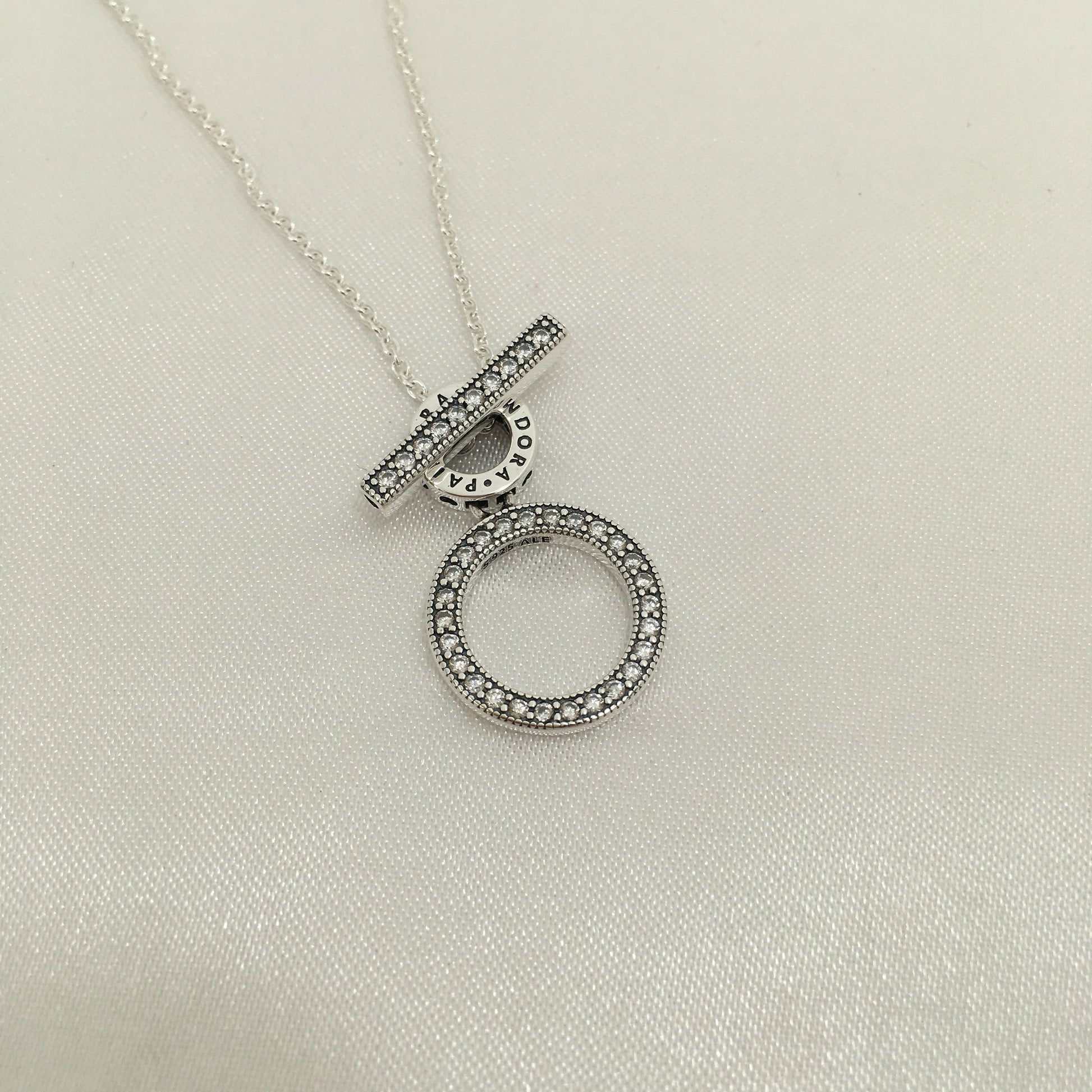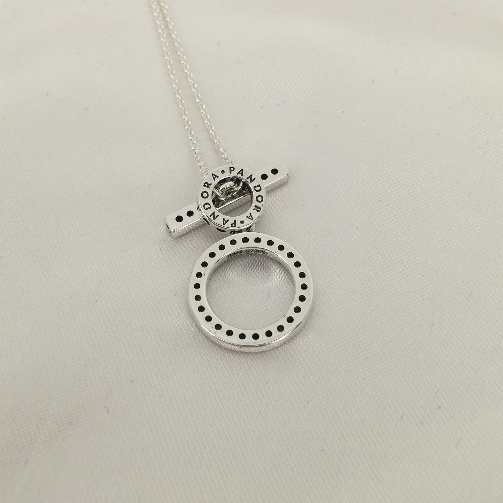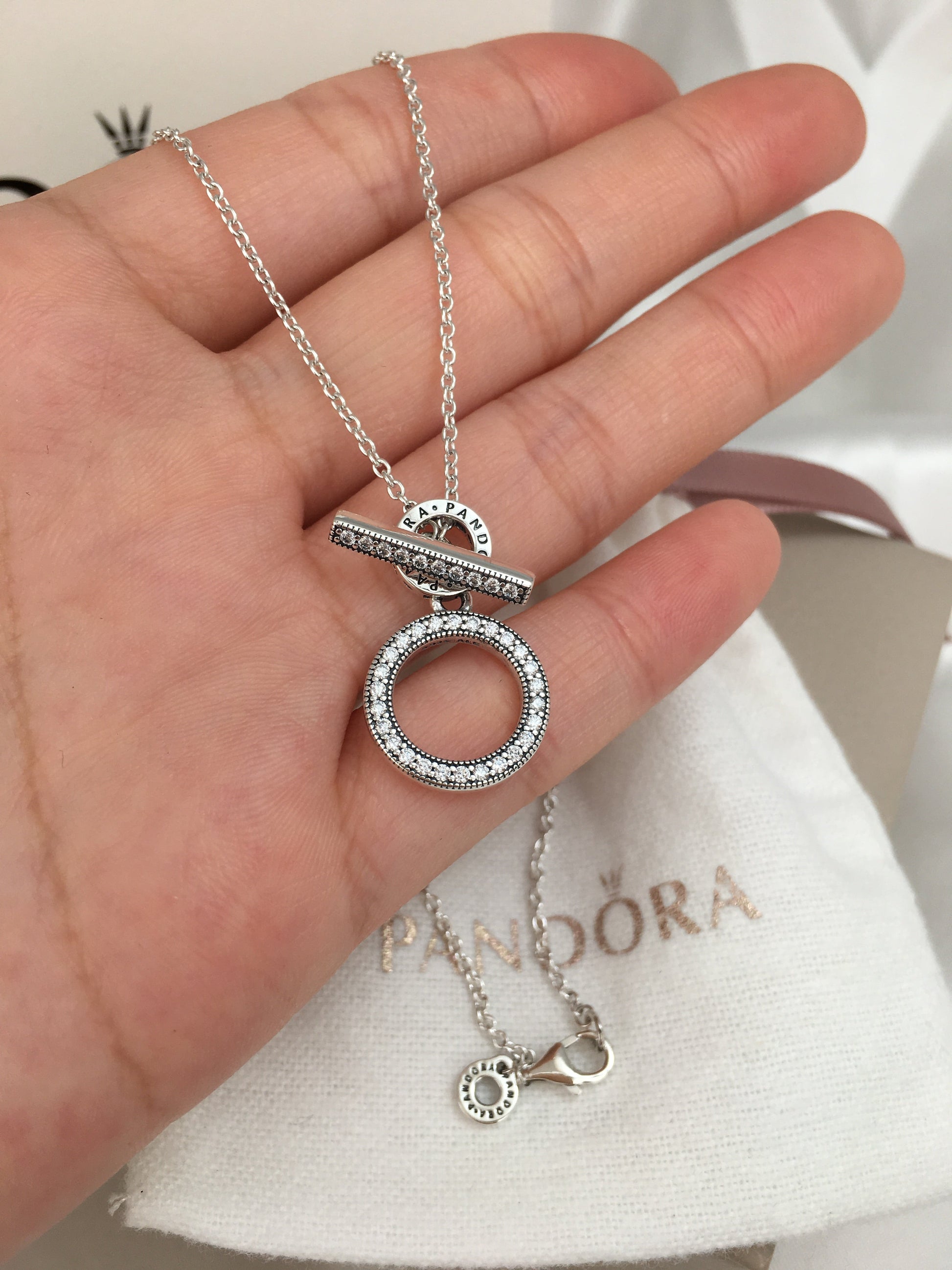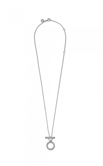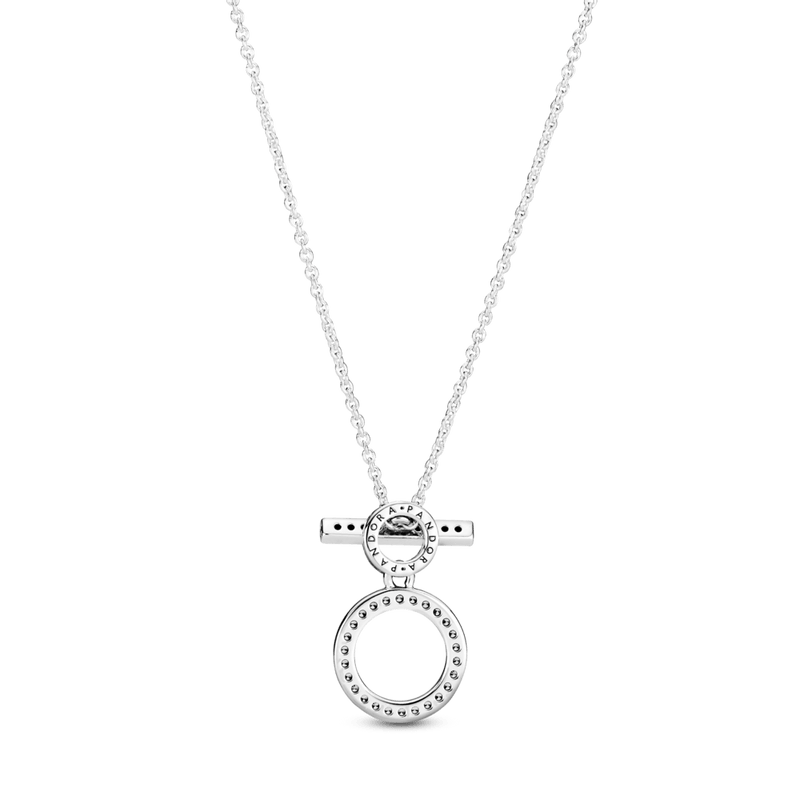 Seja ousado com o Colar Double Hoop T-bar. Geométrico e moderno, este colar ajustável com barra em T é feito à mão em prata de lei e tem pedras de zircônias cúbicas transparentes cravejadas de miçangas na frente do grande círculo e barra de alternância, que também possui detalhes de coração estriado. O logotipo aparece na frente e nas costas do pequeno círculo, junto com corações recortados na lateral. Se você usar este colar sozinho ou empilhá-lo com outros favoritos, este é um espetáculo.