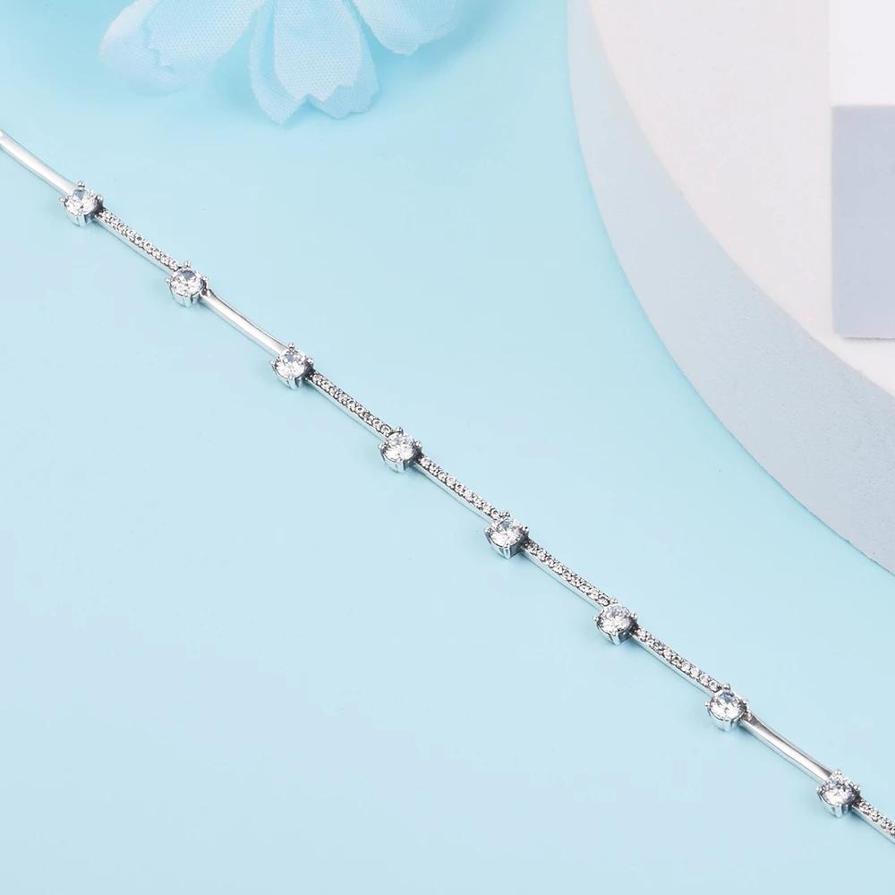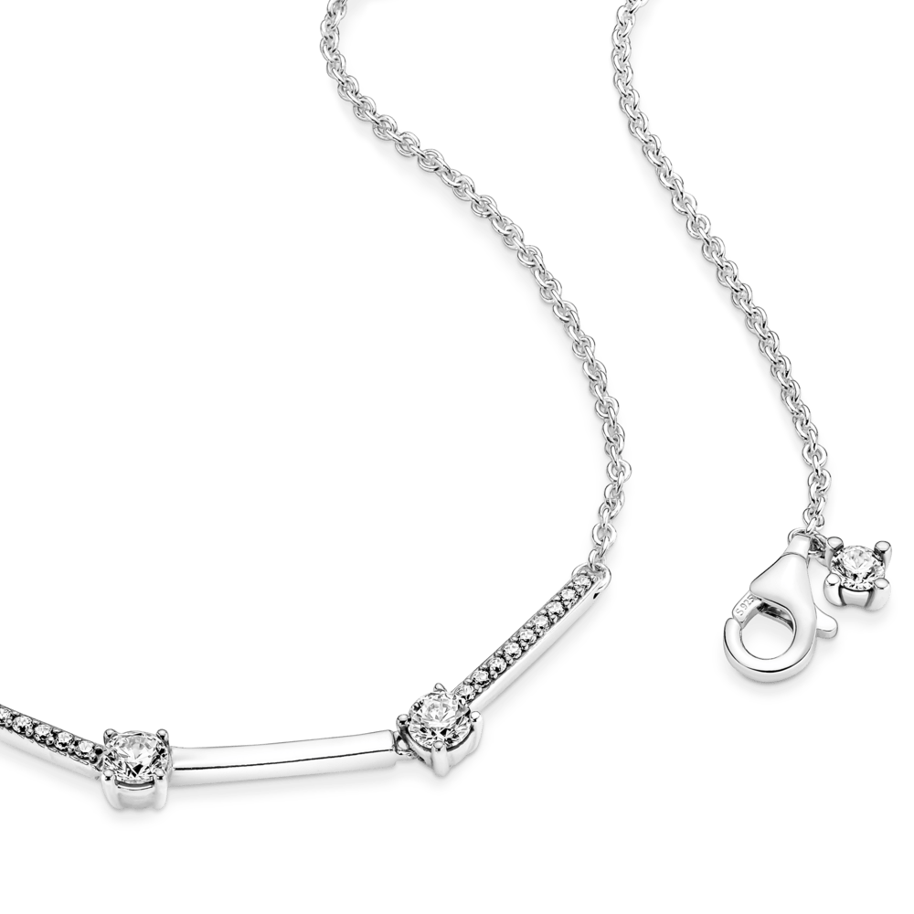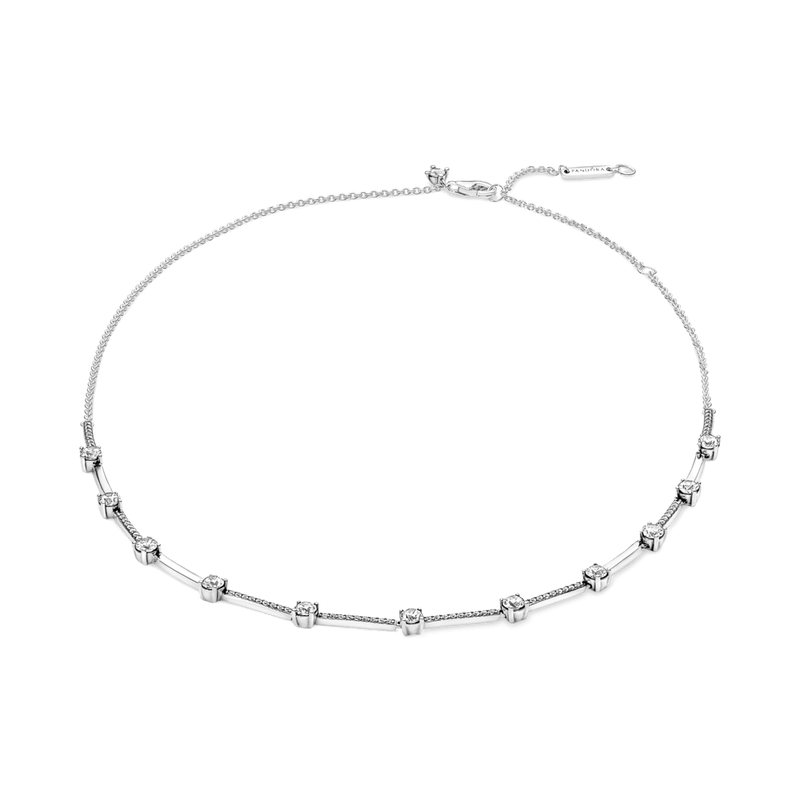 Sofisticado e elegante, este delicado Colar em Barra Pave Brilhante deslumbra. Acabado à mão em prata 925, o colar apresenta zircônias cúbicas transparentes. Com uma mistura de pavé e barras polidas unidas com pedras singulares maiores no meio. Esta peça será um divisor de águas para qualquer mulher.