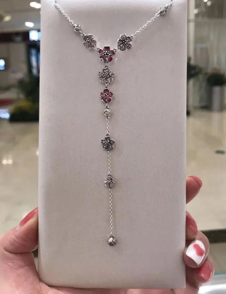 Um colar em Y é uma forma elegante de chamar a atenção para um decote. Esta iteração é inspirada na beleza da natureza, onde as flores em flor são detalhadas com esmalte tonal, cristais rosa e pedras de zircônia cúbica. Botões delicados completam o design. É equipado com um fecho deslizante para o ajuste perfeito. Use sozinho, com um decote profundo, para exibi-lo.