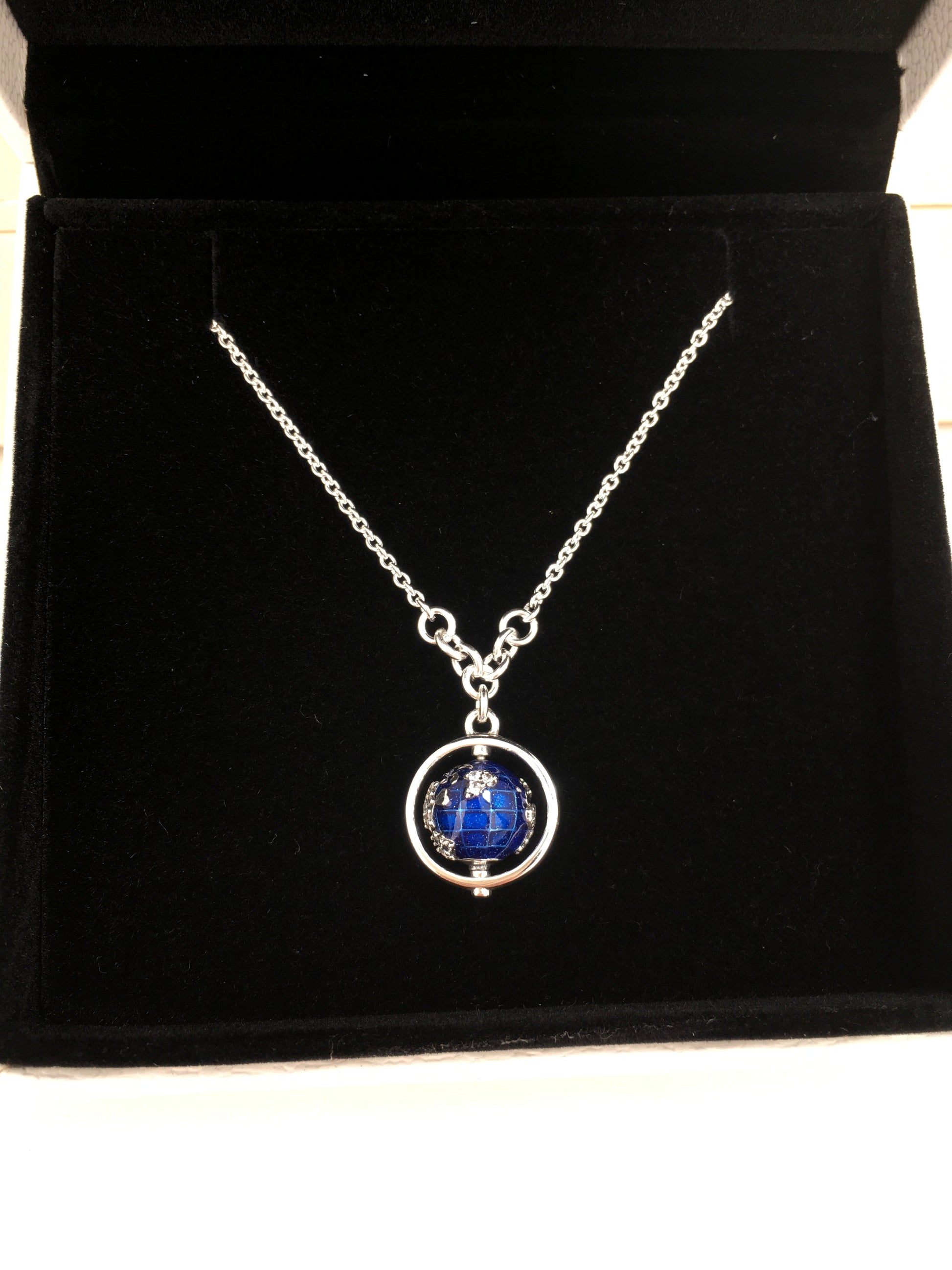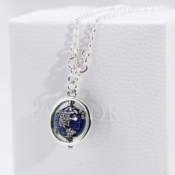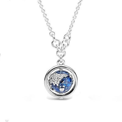 Este colar em forma de globo é feito de Prata, lembrando a exploração do mundo e dos sonhos, inspirado no nosso mundo maravilhoso. Pintado à mão com esmalte azul cintilante e um mapa-múndi prateado com pedras em forma de continentes, o amuleto da terra gira em torno de um eixo. Está pendurado em uma corrente de prata. Use um colar com outras jóias no estilo de viagem na pulseira.