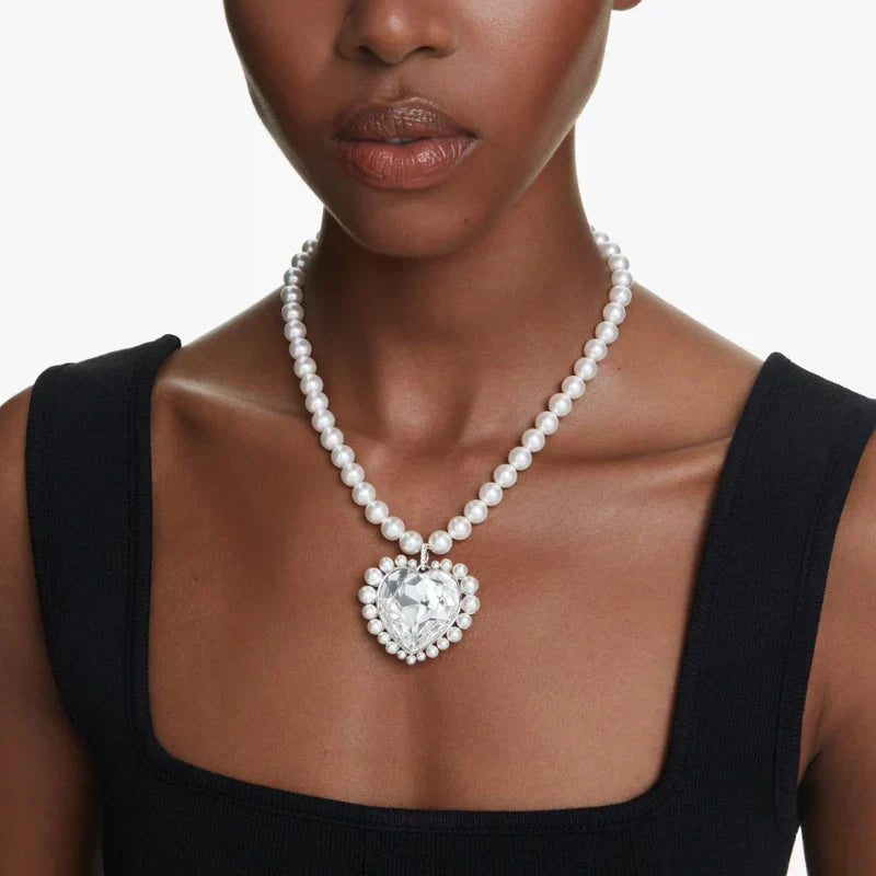 O colar de colaboração Ariana Grande apresenta um impressionante pingente de cristal em forma de coração cercado por lindas pérolas brancas. O pingente está preso a um cordão de pérola branca cintilante. O colar é feito de metal de joalheria que foi banhado a ródio para um lindo rosa claro. Combine com outras joias Swarovski e crie seu próprio estilo pessoal.