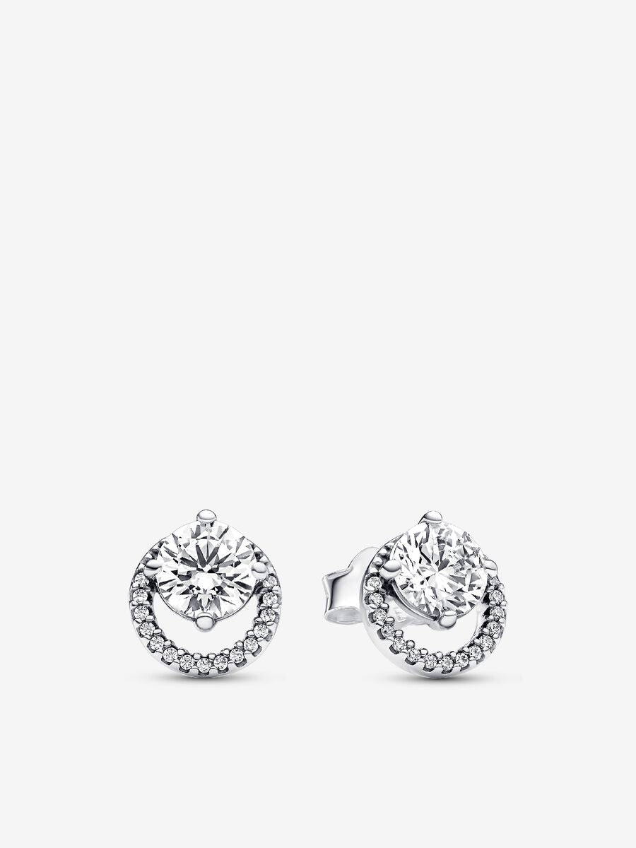 Confeccionados em prata de lei, os brincos de tarraxa apresentam uma zircônia cúbica redonda lapidação brilhante, levemente descentralizada, cercada por um deslumbrante halo pavé. Com 30 zircônias cúbicas reluzentes, esses brincos capturam o simbolismo eterno dos círculos.