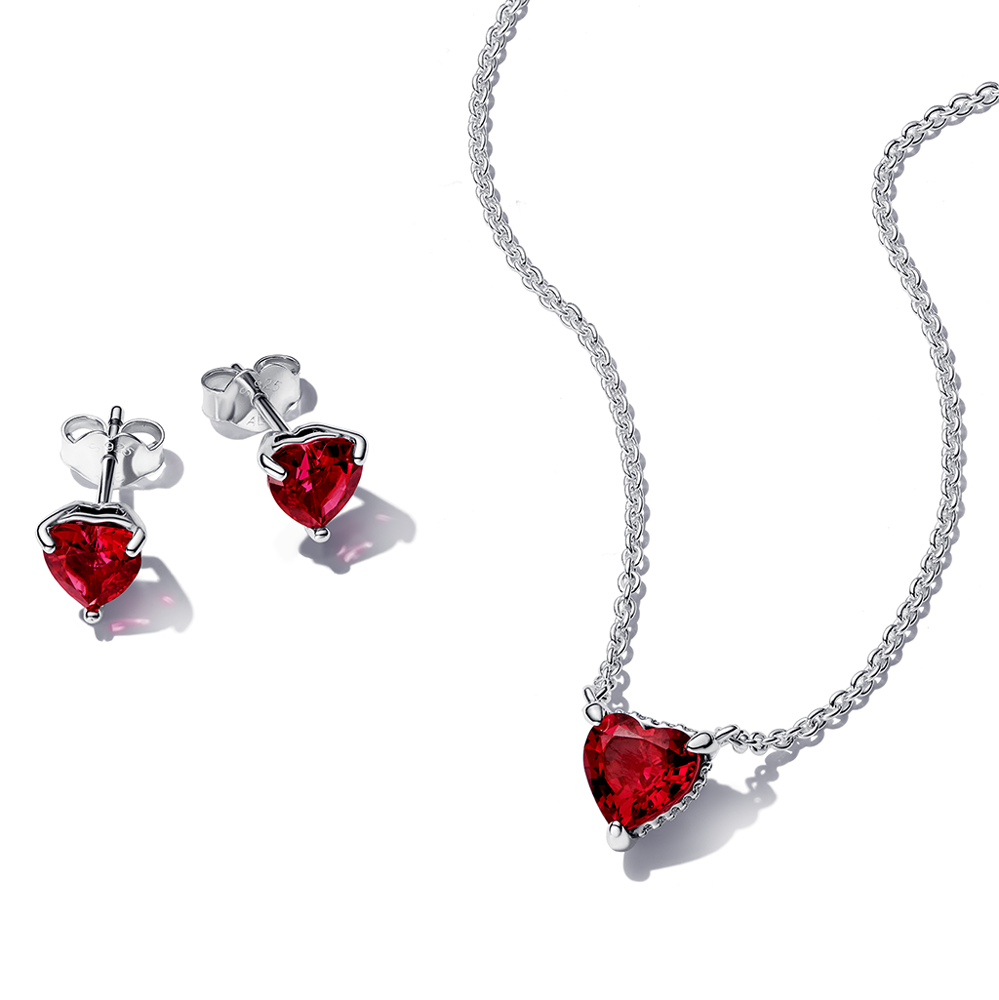 Para aquele que ilumina a vida, dê um presente atemporal que eles vão valorizar para sempre. A cor vermelha vibrante adiciona um toque romântico a estas pedras cintilantes, fazendo com que este colar, anel e brinco sejam o presente perfeito para o seu único e único.