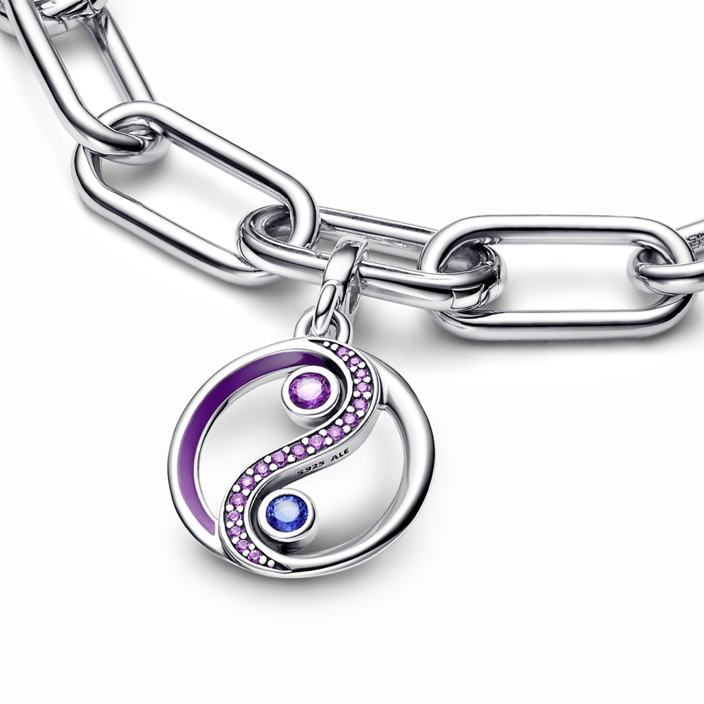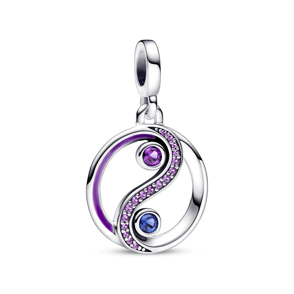 Nosso Mini Charm Medalhão Equilibrio Yin Yang trará equilíbrio ao seu estilo. Yin e Yang é um símbolo antigo que representa dualidade e harmonia. Feito de prata esterlina, este medalhão místico é decorado com detalhes coloridos de esmalte e definido com cristais feitos pelo homem brilhantemente cortados em roxo e azul, prontos para trazer ainda mais significado às suas combinações cotidianas. Estilize o seu em conectores de estilo abertos em seu colar de corrente de link, pulseira ou brincos de argola e deixe seu estilo falar volumes.