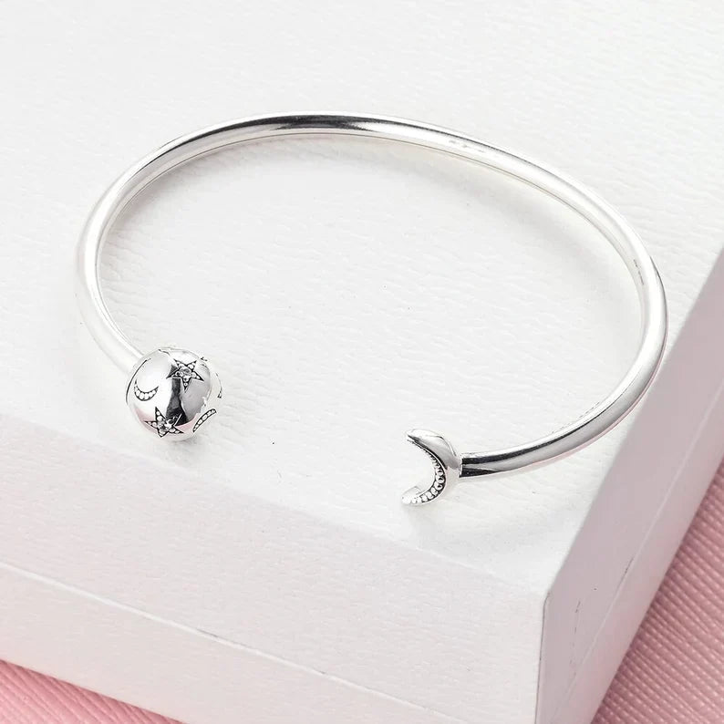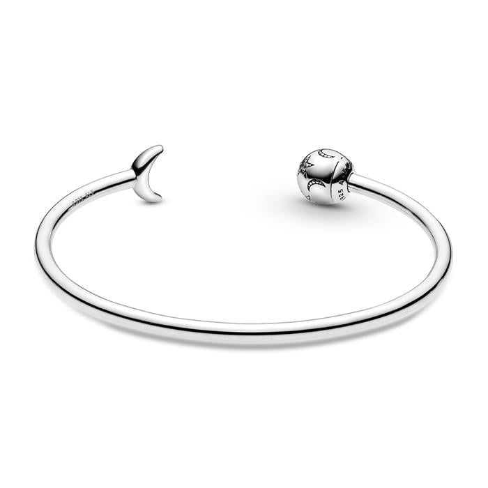 Mostre o seu amor pelo universo com a Pulseira Aberta Estrelas e Lua. Com acabamento manual em prata, esta peça inclui terminais intercambiáveis. O terminal em forma de bola apresenta estrelas gravadas com pedras brilhantes transparentes e luas crescentes decoradas com esferas. O terminal em forma de lua crescente inclui esferas subtis. Use esta Pulseira com outros modelos de inspiração celestial para um look de outra galáxia.