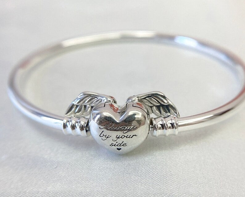 Presenteie quem você ama com a Pulseira Coração Alado. Feito à mão em prata 925, este design apresenta um fecho em forma de coração. A gravura na frente diz Always By Your Side “Sempre ao seu lado” com um pequeno coração recuado embaixo. Duas asas de anjo em movimento aparecem na parte de trás do fecho. Dê esta peça ao seu familiar junto com um par de brincos de prata esterlina em forma de coração para fazê-los se sentirem ainda mais especiais.