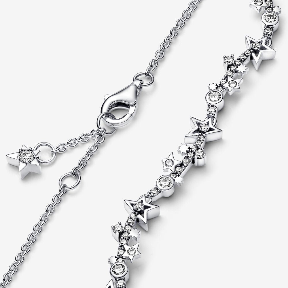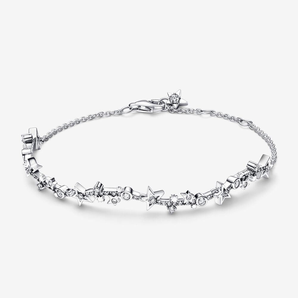 Traga as estrelas ao seu estilo com a Pulseira da Via Láctea Estrelada, trabalhada em prata esterlina e definida com zircônia cúbica clara. A mítica Via Láctea inspira nossa imaginação desde os tempos antigos, abrangendo o céu noturno com seu rio sonhador de estrelas. Nosso novo design de pulseira captura a qualidade fluida da Via Láctea com um design ondulado composto por várias barras curvas conectadas por anéis de salto para dar à pulseira uma sensação de movimento, cada uma decorada com estrelas assimétricas, perfis redondos e pavê cintilante. A pulseira é presa com um fecho de lagosta, e um pequeno pendurado de estrela adorna a extremidade da corrente. Adicione um toque de poeira estelar à sua coleção de joias com esta pulseira elegante.