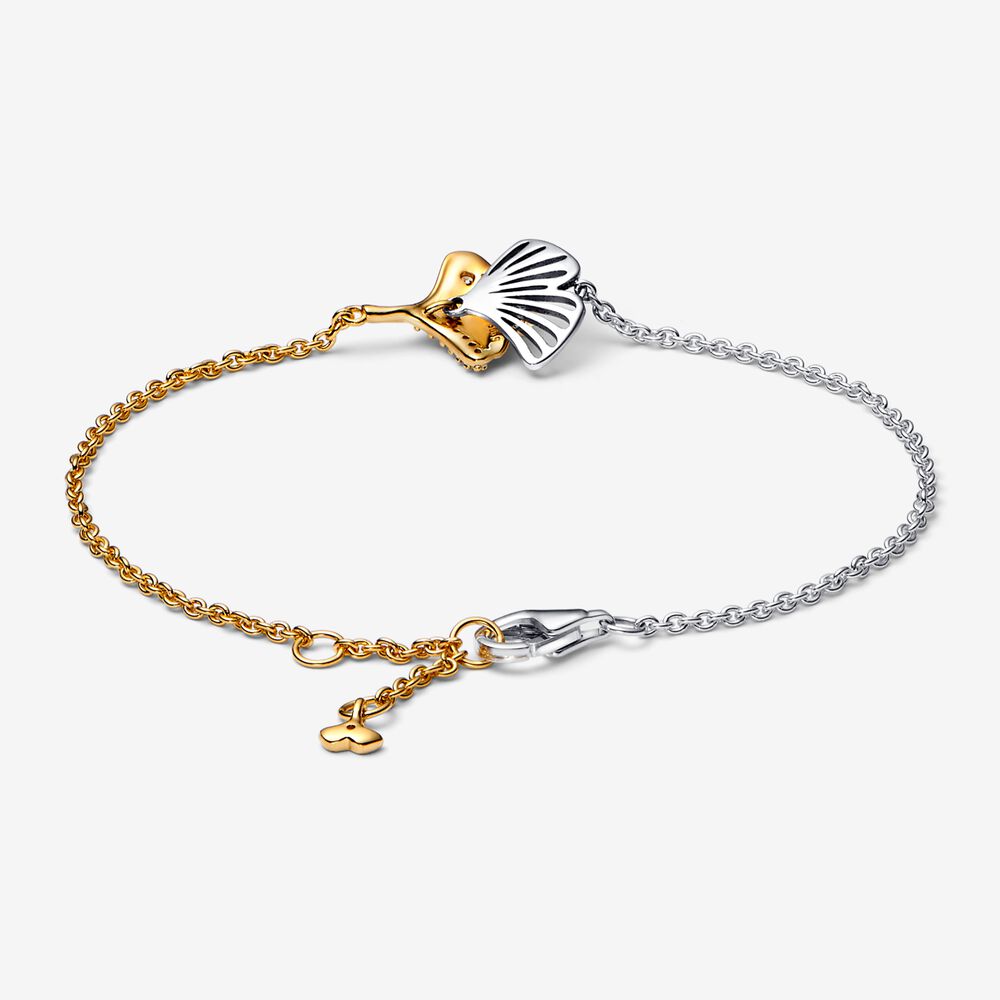 Nativa da China, a folha de Ginkgo cresce nas espécies de árvores vivas mais antigas do mundo e acredita-se que seja capaz de sobreviver a qualquer coisa. Nossa Pulseira de Dois Tons Ginkgo Duplo deixa dois tons apresenta duas folhas de Ginkgo sobrepostas. A folha superior banhada a ouro de 14k é acentuada com detalhes realistas e decorada com uma fileira de pavé ao longo de um lado e uma pedra em um canto. Está preso a uma corrente banhada a ouro de 14k. A folha de fundo de prata esterlina é detalhada com linhas recoradas ao longo de seu comprimento, assemelhando-se aos vincos característicos do Ginkgo . Está preso a uma corrente de prata 925. O fechamento brilha com uma pequena folha de Ginkgo banhada a ouro de 14k com uma pedra. Canalize o poder deste ícone antigo com esta pulseira de dois tons.